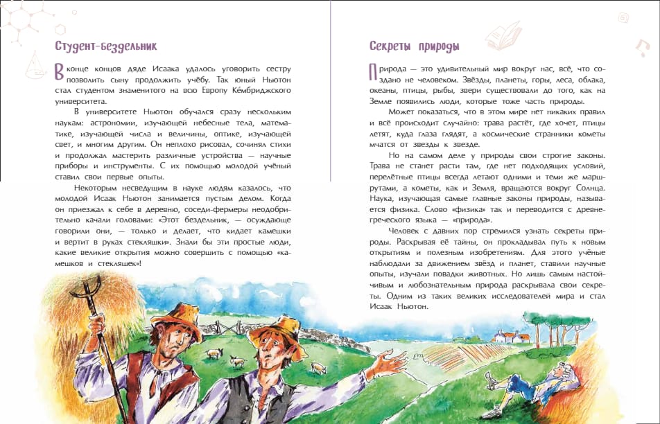 Белый цвет состоит на самом деле из семи цветов. Все тела во Вселенной взаимно притягивают друг друга. Эти удивительные открытия сделал сын простого английского фермера Исаак Ньютон. Он также сформулировал три главных закона механики, стал первым учёным, посвящённым в рыцари, и членом парламента.