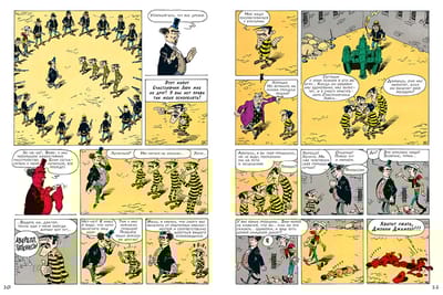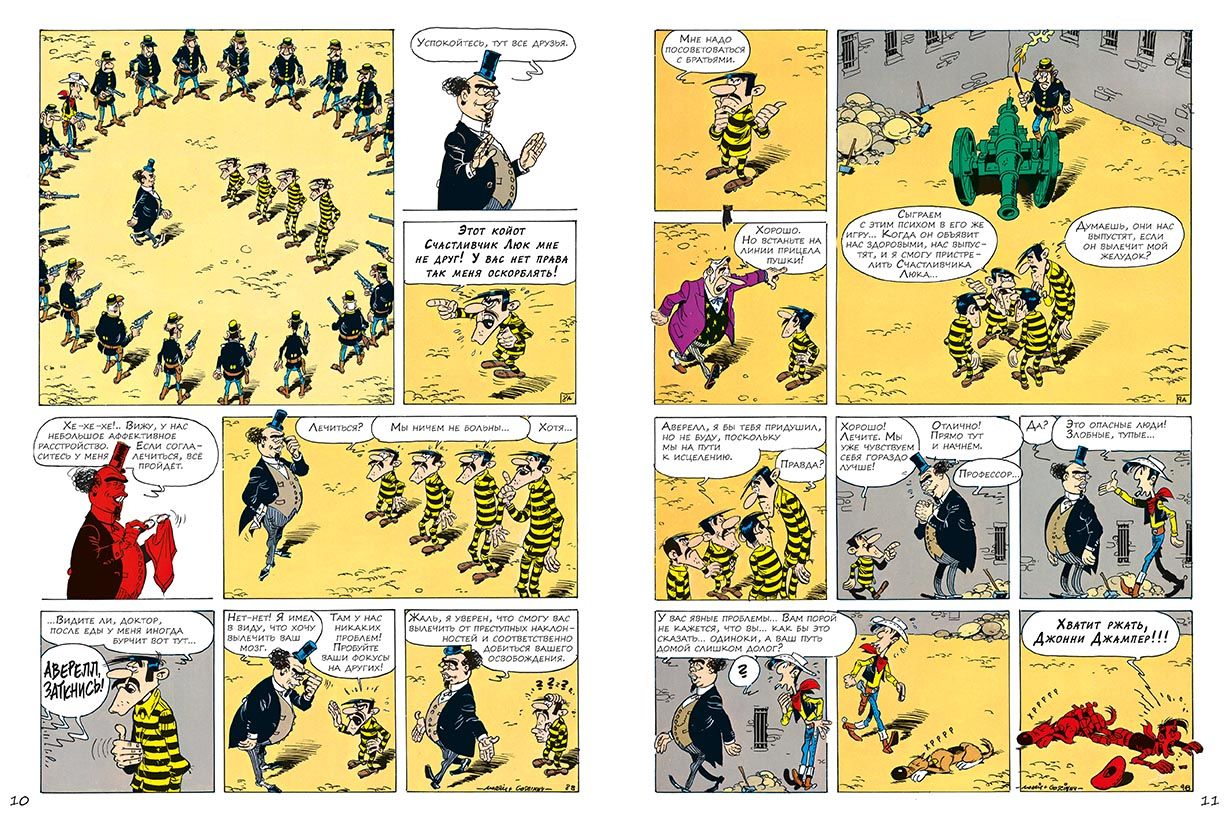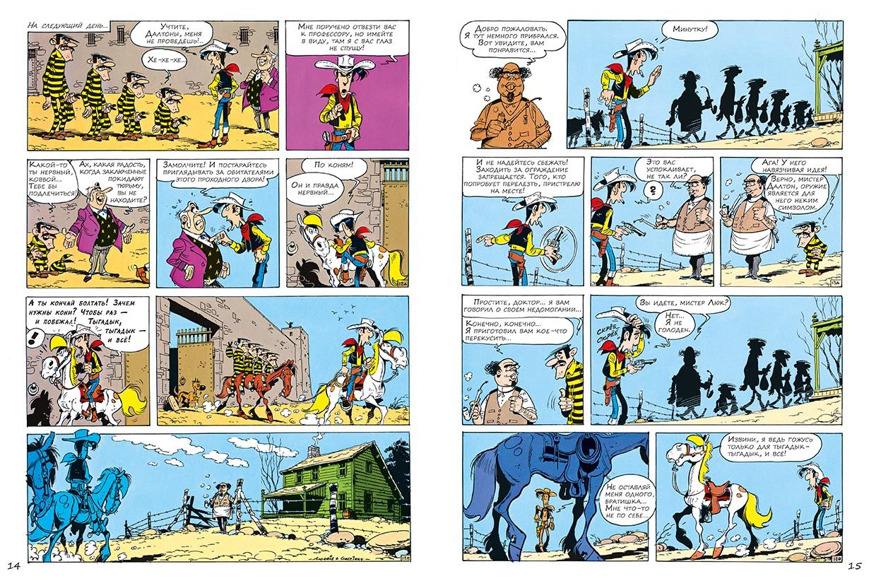 «Счастливчик Люк», наряду с «Тинтином» и «Астериксом», входит в тройку самых популярных франко-бельгийских комиксов в мире. Общее количество экземпляров книг этой серии перевалило за 300 миллионов. «Счастливчик Люк» уже переведён более чем на 25 языков, и наконец-то появился на русском! Счастливчик Люк – обаятельный и бесстрашный одинокий ковбой времён покорения американского Дикого Запада. Он – настоящий герой, и даже супергерой, честный и справедливый, защитник всех слабых и беспомощных. Он всегда стоит на стороне закона, помогая местным властям противостоять бандитам и другим злодеям. Как у истинного супергероя, у него есть своя суперспособность: стрелять быстрее собственной тени! Каждая история о Счастливчике Люке – это захватывающий и весьма познавательный комедийный вестерн, в котором находят отражение реальные события, связанные с освоением Дикого Запада. На этот раз в небольшой техасский городок приезжает светило психиатрии из Европы, профессор Отто фон Химбергайст. В одной из тюрем он намерен встретиться с самыми неисправимыми бандитами, чтобы по собственной методике раз и навсегда излечить их от преступных наклонностей. Счастливчику Люку поручено сопровождать профессора и оказывать ему всяческое содействие. Ну а их подопытными пациентами становятся давнишние знакомые Люка – братья Далтоны. Комиксы о Счастливчике Люке рассчитаны на самую широкую аудиторию. И дети, и читатели постарше останутся в восторге от приключенческой сюжетной канвы, виртуозного карикатурного рисования, доброй иронии и юмора буквально в каждом кадре. Юмор, основанный, как правило, на игре слов и принципах комедии положений, никогда не опускается ниже пояса. И несмотря на то, что герои то и дело размахивают пистолетами и делают пиф-паф, в этих историях нет ни грубости, ни насилия. Главный герой стреляет, только чтобы метким выстрелом ловко выбить оружие из рук противников. А противники, естественно, всегда промахиваются. Можно смело сказать, что ни в одной истории ни одного персонажа не пострадало. Если не считать синяков и шишек, которые периодически заслуженно получают отрицательные герои. Особо стоит отметить удобный для чтения крупный шрифт, благодаря которому комиксы о Счастливчике Люке подойдут начинающим читателям и станут для них первой ступенькой к чтению романов Фенимора Купера и Майн Рида. Создатели «Счастливчика Люка» – два гениальных юмориста, бельгийский художник Морис де Бевер, работавший под псевдонимом Моррис, и француз Рене Госинни, хорошо известный русским читателям по циклу рассказов «Малыш Николя» и по комиксам об Астериксе, где он также выступал как сценарист.