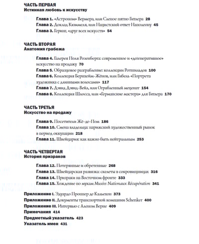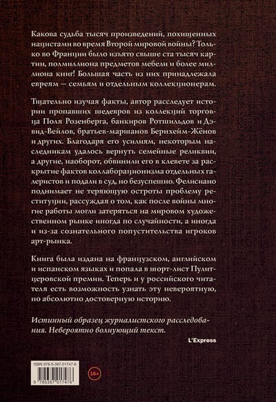 Какова судьба многих тысяч произведений мирового искусства, похищенных нацистами во время Второй мировой войны? В одной только Франции было изъято более 100 тысяч картин, полмиллиона предметов мебели и более миллиона книг! Большая часть из них принадлежала евреям — семьям и отдельным коллекционерам. Автор книги называет цифры в 20-40 тысяч – впечатляющее количество вещей, словно канувших в лету. Тщательно изучая все факты и прослеживая затерянные следы, Фелисиано шаг за шагом расследует истории пропавших картин из коллекции парижского торговца Поля Розенберга, банкиров Ротшильдов и Дэвид-Вейлов, братьев-маршанов Бернхейм-Жёнов, коллекционера Альфонса Канна и других. Благодаря его усилиям, некоторым наследникам удалось вернуть семейные реликвии, а другие, наоборот, обвинили его в клевете за раскрытие фактов коллаборационизма отдельных галеристов и подали в суд, но безуспешно. Фелисиано поднимает не теряющую остроты проблему реституции, рассуждая о том, как после войны многие работы могли затеряться на мировом художественном рынке иногда по случайности, а иногда и из-за сознательного попустительства игроков арт-рынка. Отдельное внимание автор уделяет роли Швейцарии в разграблении Франции, ведь после войны многие украденные произведения искусства были обнаружены именно там.