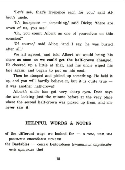 Текст пособия адаптирован в учебных целях до уровня Elementary. Каждая глава сопровождается комментарием, переводом трудных слов и выражений, а также заданиями с учётом требований ОГЭ. Они направлены не только на проверку понимания текста, но и на отработку лексики, грамматики, а также развитие умений чтения, устной речи и письма. Упражнения позволяют сформировать и развить коммуникативные компетенции, столь необходимые для успешной сдачи итогового экзамена в 9 классе.