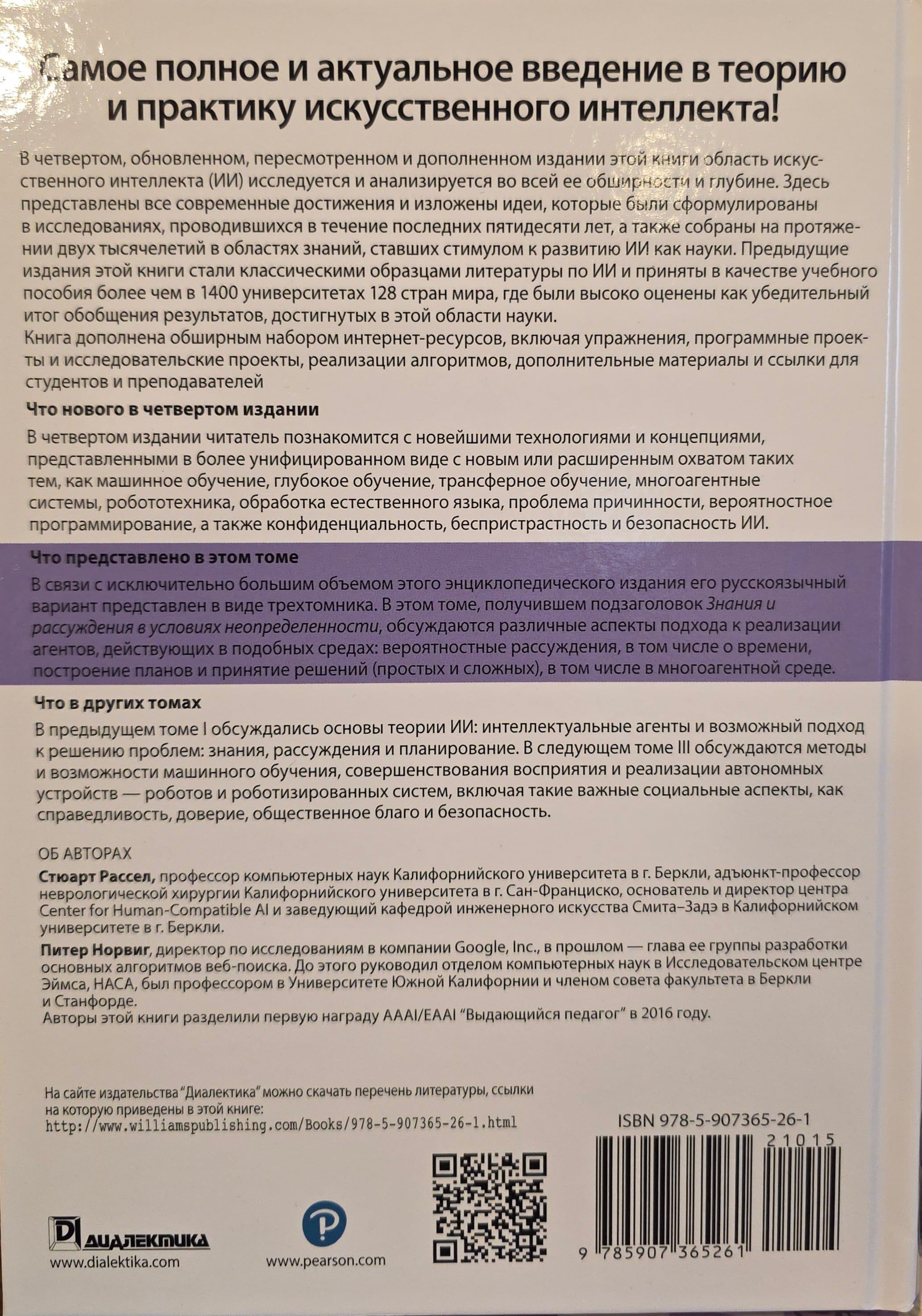 В четвертом, обновленном, пересмотренном и дополненном издании этой книги область искусственного интеллекта (ИИ) исследуется и анализируется во всей ее обширности и глубине. Здесь представлены все современные достижения и изложены идеи, которые были сформулированы в исследованиях, проводившихся в течение последних пятидесяти лет, а также собраны на протяжении двух тысячелетий в областях знаний, ставших стимулом к развитию ИИ как науки. Предыдущие издания этой книги стали классическими образцами литературы по ИИ и приняты в качестве учебного пособия более чем в 1400 университетах 128 стран мира, где были высоко оценены как убедительный итог обобщения результатов, достигнутых в этой области науки.