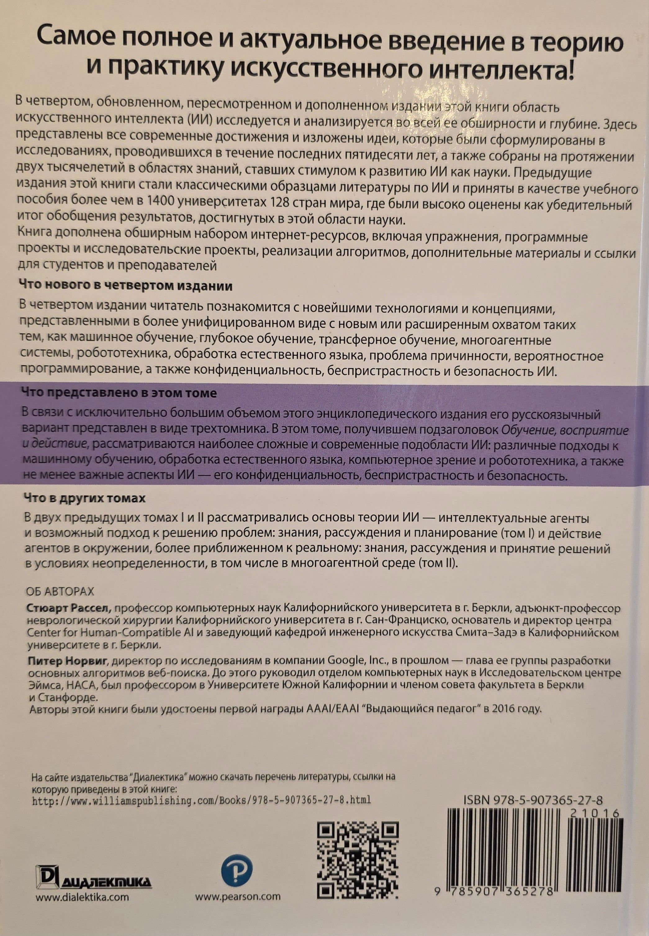 В четвертом, обновленном, пересмотренном и дополненном издании этой книги область искусственного интеллекта (ИИ) исследуется и анализируется во всей ее обширности и глубине. Здесь представлены все современные достижения и изложены идеи, которые были сформулированы в исследованиях, проводившихся в течение последних пятидесяти лет, а также собраны на протяжении двух тысячелетий в областях знаний, ставших стимулом к развитию ИИ как науки. Предыдущие издания этой книги стали классическими образцами литературы по ИИ и приняты в качестве учебного пособия более чем в 1400 университетах 128 стран мира, где были высоко оценены как убедительный итог обобщения результатов, достигнутых в этой области науки.