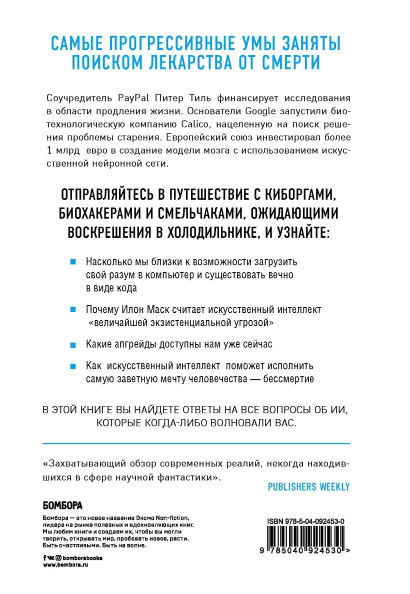 Книга о том, как биохакеры, трансгуманисты, ученные и миллиардеры пытаются решить проблему смерти с помощью технологий и искусственного интеллекта. Вы узнаете, насколько мы близки к возможности существовать вечно в виде кода, почему Илон Маск считает искусственный интеллект «величайшей экзистенциальной угрозой», какие апгрейды доступны нам уже сейчас, и как искусственный интеллект поможет исполнить самую заветную мечту человечества – бессмертие.