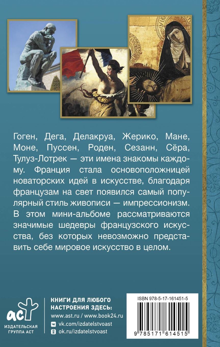 К искусству во Франции всегда относились серьезно, что неудивительно, ведь территория этого государства уже с первобытных времен была сердцем европейской культуры. Красота, чувства, любовь, романтика, революционные настроения, победа, триумф — французские шедевры наполнены всеми красками жизни и в полной мере отражают многоликую историю страны. Из этого альбома вы узнаете о французском изобразительном искусстве, а также проследите его развитие на протяжении веков.
