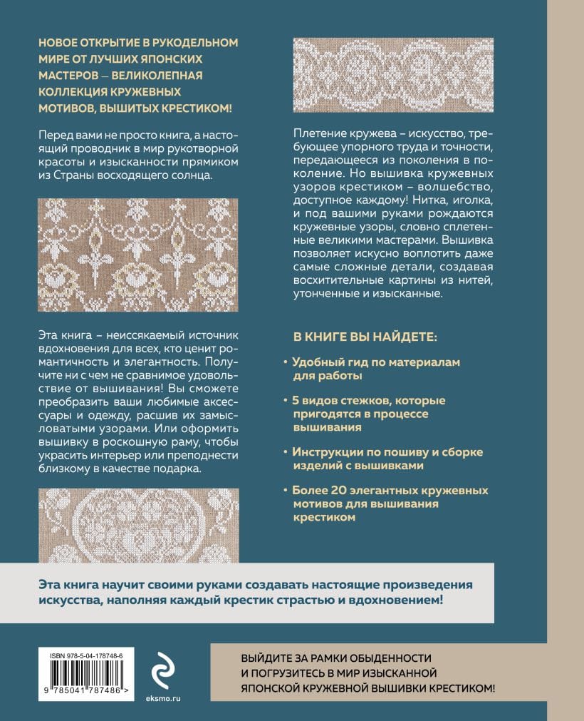 Пусть эти страницы станут вашим вдохновением в мире вышивки. Пусть каждый шов превратится в невероятную поэзию. Пусть каждый мотив станет вашим собственным произведением искусства, которым вы сможете порадовать себя и своих близких. В этой книге вы найдете: • Удобный гид по материалам для работы. • 5 видов стежков, которые пригодятся в процессе вышивания. • Инструкции по пошиву и сборке изделий с вышивками. • Более 20 элегантных кружевных мотивов для вышивания крестом. • И получите невероятное эстетическое наслаждение, перелистывая страницы! Выйдите за рамки обыденности и погрузитесь в мир изысканной японской кружевной вышивки крестиком!