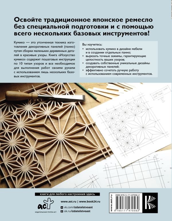 Кумико — это утонченная техника изготовления декоративных панелей (панно) путем сборки маленьких деревянных деталей в красивые узоры. Книга содержит пошаговые инструкции по 10 типам узоров и все необходимое для выполнения работ своими руками с использованием лишь нескольких базовых инструментов. Вы научитесь использовать кумико в дизайне мебели и в создании отдельных панно, вырезать точные зажимы, гарантирующие целостность ваших узоров, создавать собственные уникальные дизайны декоративных панелей, эффективно сочетать ручную работу с использованием современных инструментов.