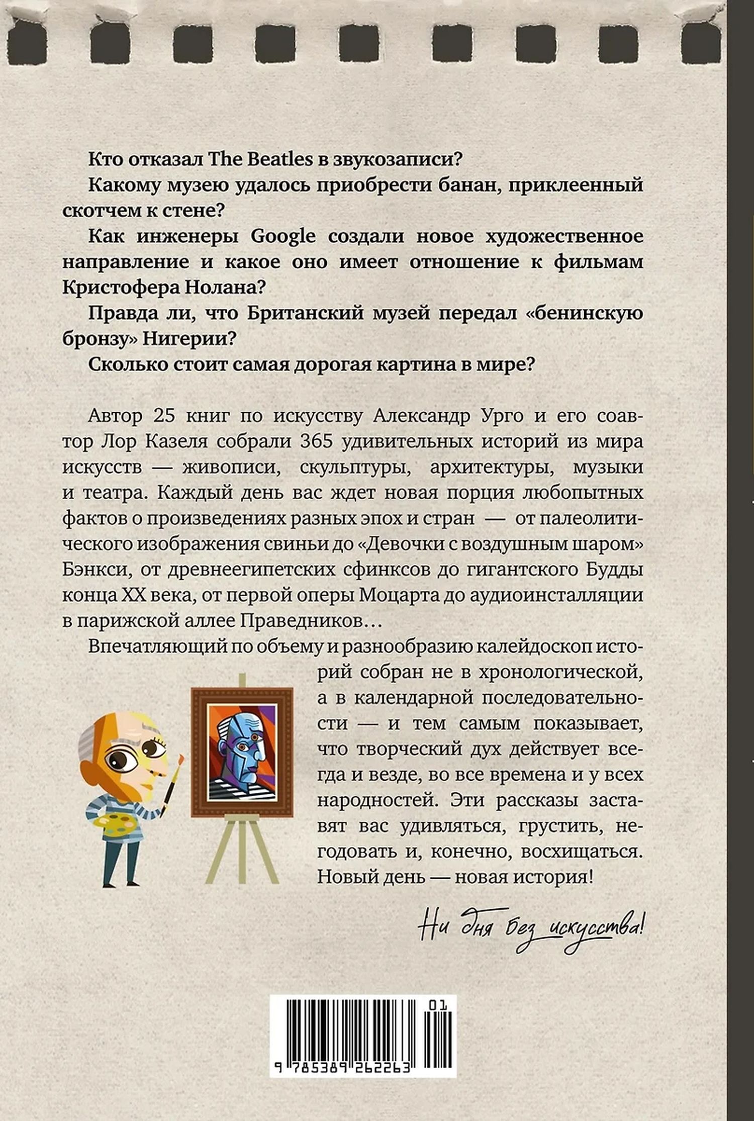 Автор 25-ти книг по искусству Александр Урго и его соавтор Лор Казеля рассказали 365 увлекательных историй об изобразительном искусстве, архитектуре, музыке, танце и театре. Представив их не в хронологической, а в календарной последовательности, они показали, что творческий дух действует всегда и везде, во все времена и у всех народов. Впечатляющий по объему и разнообразию калейдоскоп историй об искусстве — от наскальных росписей до уличных граффити и от египетских сфинксов до парижских аудио-инсталляций — заставит вас удивляться, грустить, даже негодовать и, конечно, восхищаться.