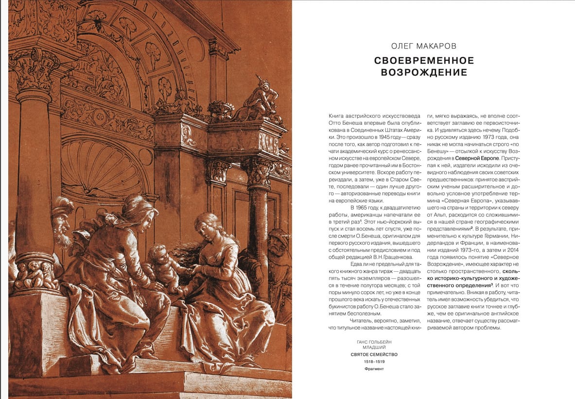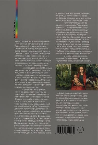 Книга известного австрийского историка искусства Отто Бенеша (1896–1964) посвящена ренессансным движениям XVI столетия за пределами Италии. Более всего автора привлекает взаимодействие этих движений — художественных и гуманистических, религиозно-идеологических и научных; его результатом стало формирование к северу от Альп, прежде всего в Германии, Нидерландах и Франции, мощного очага духовной и художественной культуры, равновеликой культуре итальянских мастеров — родоначальников европейского Возрождения. На страницах книги прослеживаются творческие поиски и достижения Альбрехта Дюрера, Маттиаса Грюневальда, Ганса Гольбейна Младшего, Питера Брейгеля Старшего, Жака Белланжа и других живописцев и скульпторов, открывших на Севере Европы уникальный «второй фронт» интернационального художественного прогресса — противоречивого, с нередкими поворотами вспять, к средневековому прошлому. Богато иллюстрированное издание адресовано искусствоведам, культурологам, а также широкому кругу читателей, интересующихся западноевропейским искусством.