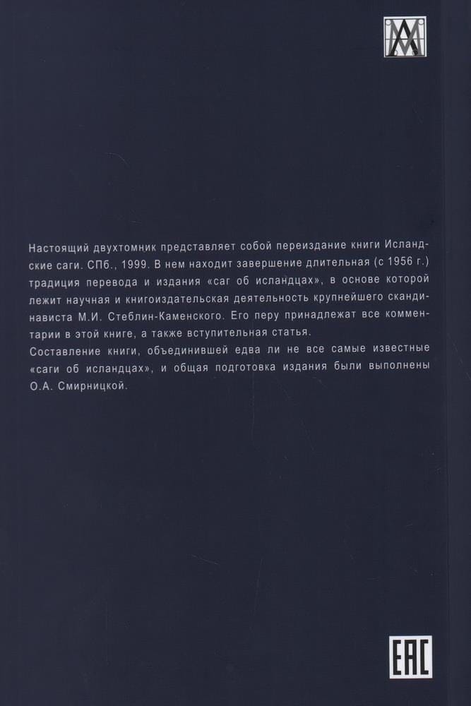 Настоящий двухтомник представляет собой переиздание книги Исландские саги. СПб., 1999. В нем находит завершение длительная (с 1956 г.) традиция перевода и издания «саг об исландцах», в основе которой лежит научная и книгоиздательская деятельность крупнейшего скандинависта М.И. Стеблин-Каменского. Его перу принадлежат все комментарии в этой книге, а также вступительная статья.