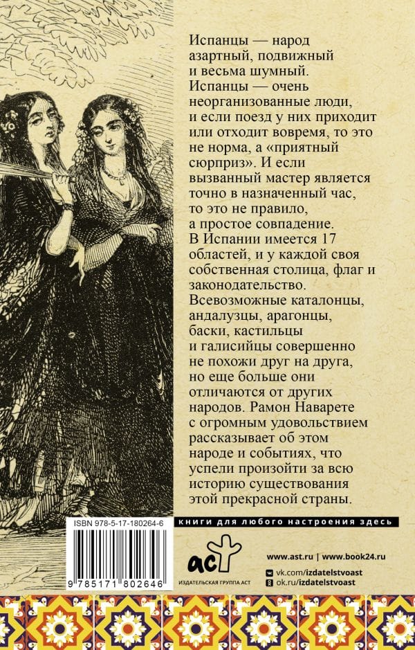 Испанцы — народ азартный, подвижный и весьма шумный. Испанцы — очень неорганизованные люди, и если поезд у них приходит или отходит вовремя, то это не норма, а «приятный сюрприз». И если вызванный мастер является точно в назначенный час, то это не правило, а простое совпадение. В Испании имеется 17 областей, и у каждой своя собственная столица, флаг и законодательство. Всевозможные каталонцы, андалузцы, арагонцы, баски, кастильцы и галисийцы совершенно не похожи друг на друга, но еще больше они отличаются от других народов.