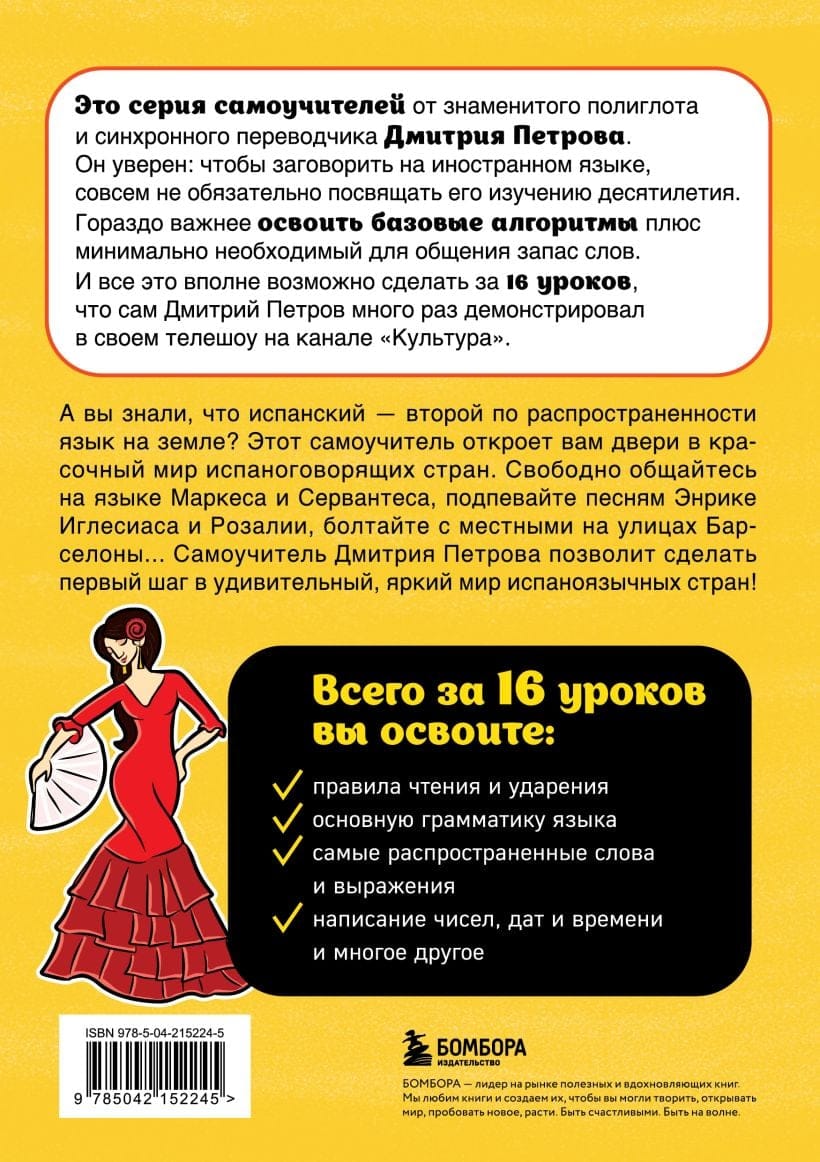 А вы знали, что испанский — второй по распространенности родной язык на земле? Этот самоучитель откроет вам двери к красочному миру испаноговорящих стран. Свободно общайтесь на языке Маркеса и Сервантеса, подпевайте песням Энрике Иглесиаса и Розалии, болтайте с местными на улицах Барселоны... Самоучитель Дмитрия Петрова позволит сделать первый шаг в удивительный яркий мир испаноязычных стран!