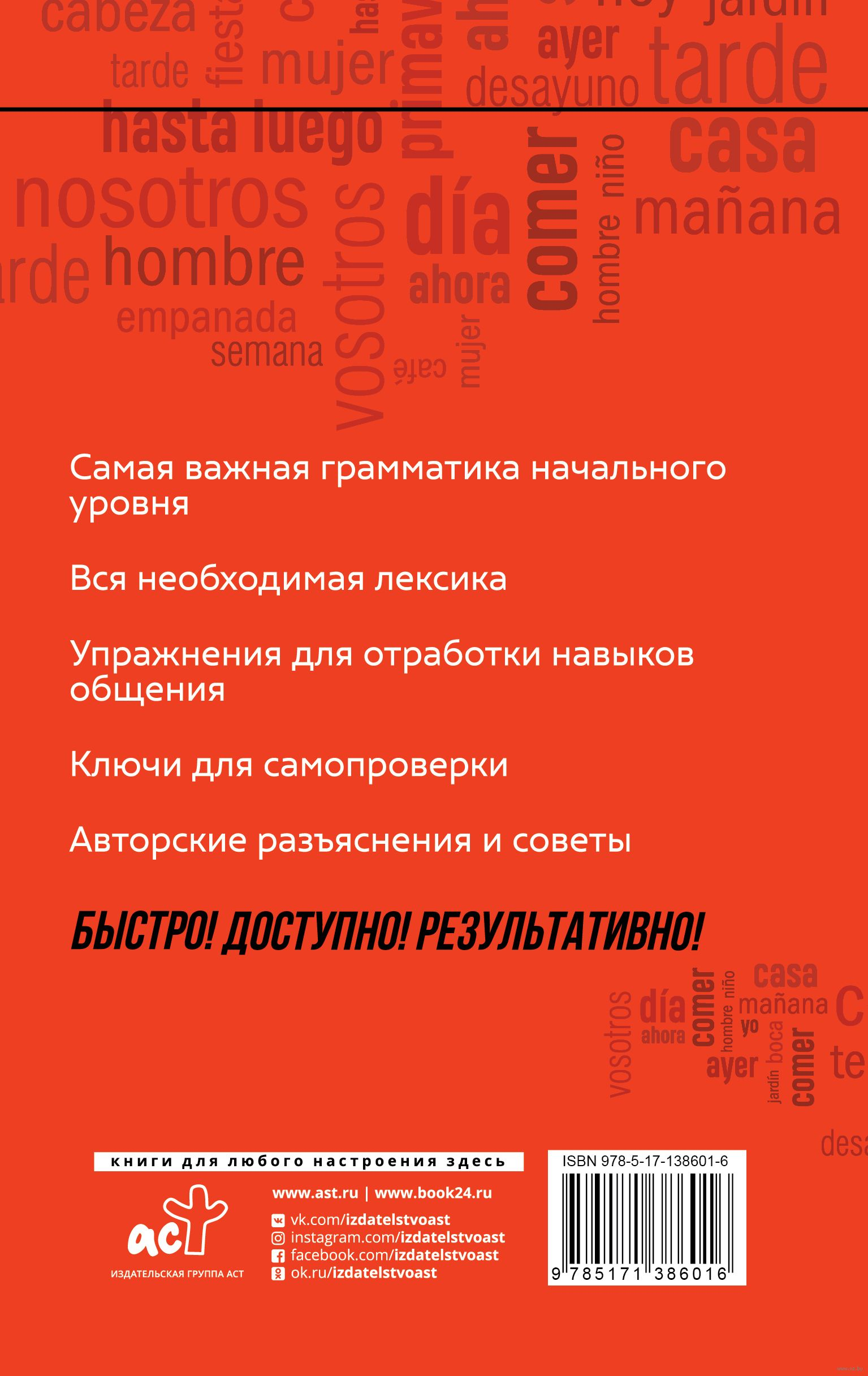 Данный самоучитель поможет в краткий срок овладеть лексическим и грамматическим минимумом начального уровня и простыми формами разговорной речи. Материал курса разбит на 10 уроков, в которых представлены основные темы грамматики и полезная лексика, необходимая в повседневном общении. Для отработки практических навыков предлагается большое количество упражнений. В случае затруднения вы сможете проверить себя по ключам. Все тексты и диалоги даются с параллельным переводом на русский язык. Книга адресована всем, кто хочет в краткие сроки овладеть основами испанского языка.