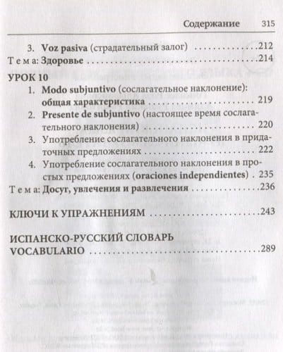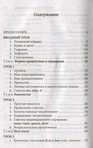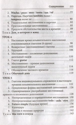 Самоучитель поможет в краткий срок овладеть лексическим и грамматическим минимумом начального уровня и простыми формами разговорной речи. Материал курса разбит на 10 уроков, в которых представлены основные темы грамматики и полезная лексика, необходимая в повседневном общении. Для отработки практических навыков предлагается большое количество упражнений с ответами. Все тексты и диалоги даются с параллельным переводом на русский язык, в конце книги также помещен испанско-русский словарь. Книга адресована всем, кто хочет в краткие сроки овладеть основами испанского языка.