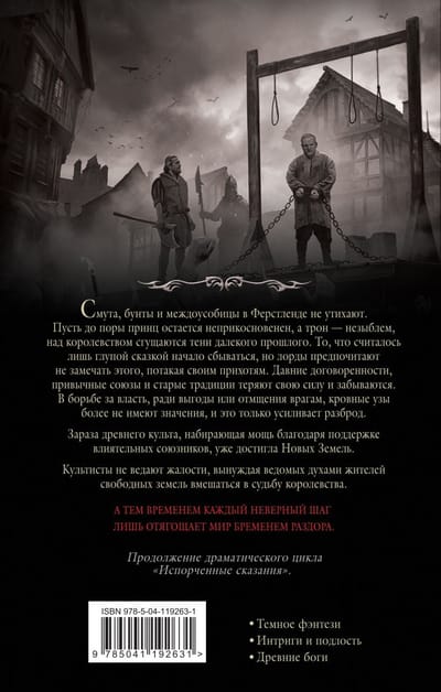 Превосходная проработка характеров показывает сложные взаимоотношения героев, объясняет их поступки и раскрывает последствия. Смута, бунты и междоусобицы в Ферстленде не утихают. Пусть до поры принц остается неприкосновенен, а трон — незыблем, над королевством сгущаются тени далекого прошлого. То, что считалось лишь глупой сказкой, начало сбываться, но лорды предпочитают не замечать этого, потакая своим прихотям. Давние договоренности, привычные союзы и старые традиции теряют свою силу и забываются. В борьбе за власть, ради выгоды или отмщения врагам, кровные узы более не имеют значения, и это только усиливает разброд. Зараза древнего культа, набирающая мощь благодаря поддержке влиятельных союзников, уже достигла Новых Земель. Культисты не ведают жалости, вынуждая ведомых духами жителей свободных земель вмешаться в судьбу королевства. А тем временем каждый неверный шаг лишь отягощает мир бременем раздора. Продолжение драматического цикла «Испорченные сказания», второй том.