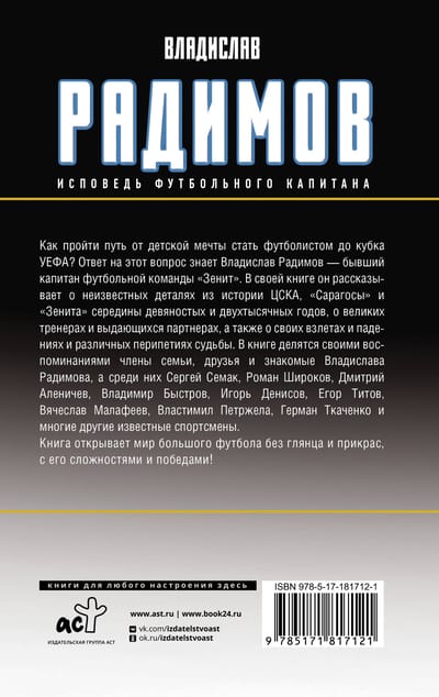 Как пройти путь от детской мечты стать футболистом до Кубка УЕФА? Ответ на этот вопрос знает Владислав Радимов — бывший капитан футбольной команды «Зенит». В своей книге он рассказывает о неизвестных деталях из истории ЦСКА, «Сарагосы» и «Зенита» середины девяностых и двухтысячных годов, о великих тренерах и выдающихся партнёрах, а также о своих взлётах и падениях и различных перипетиях судьбы.