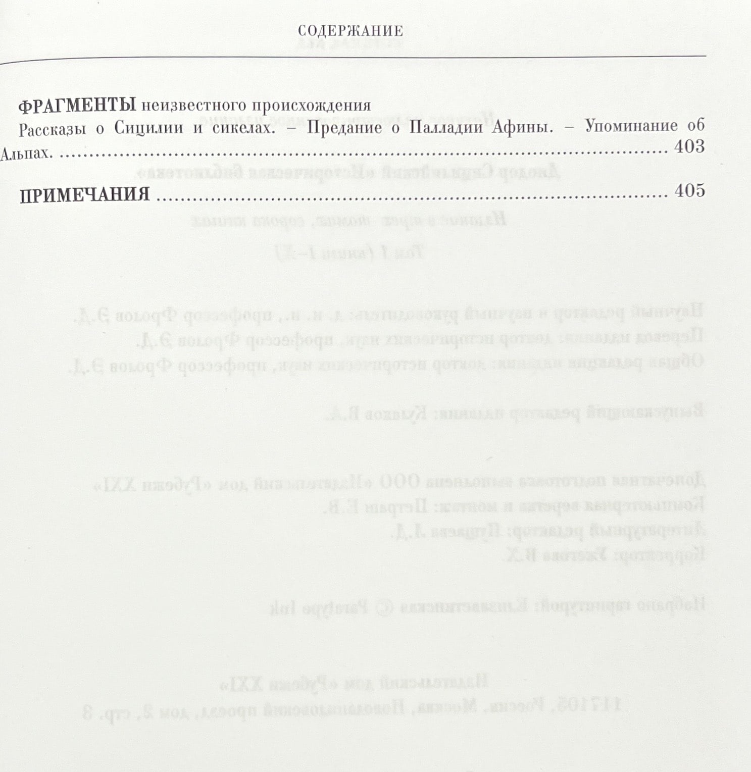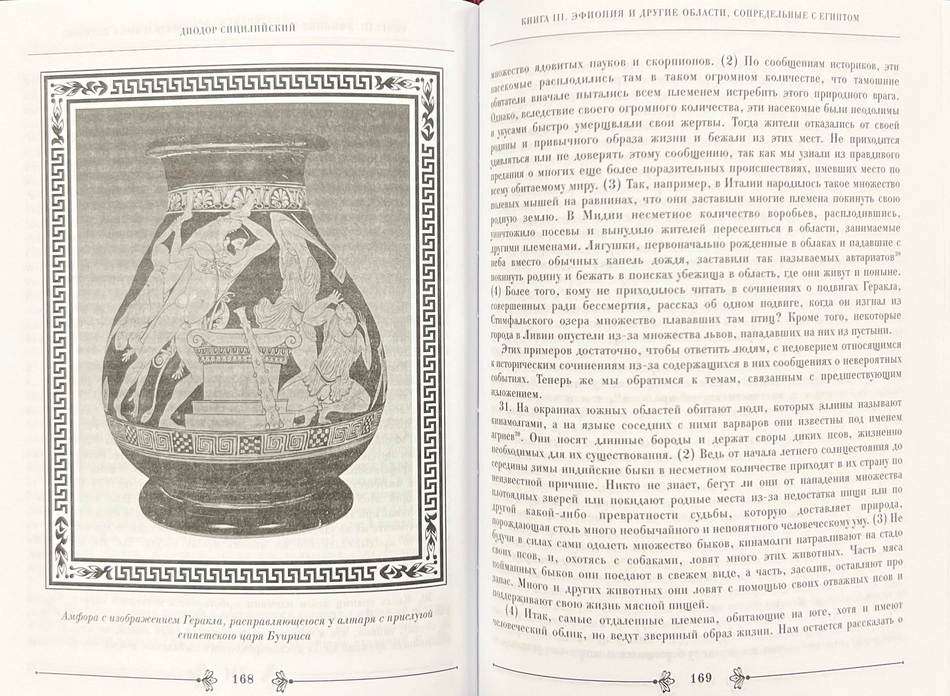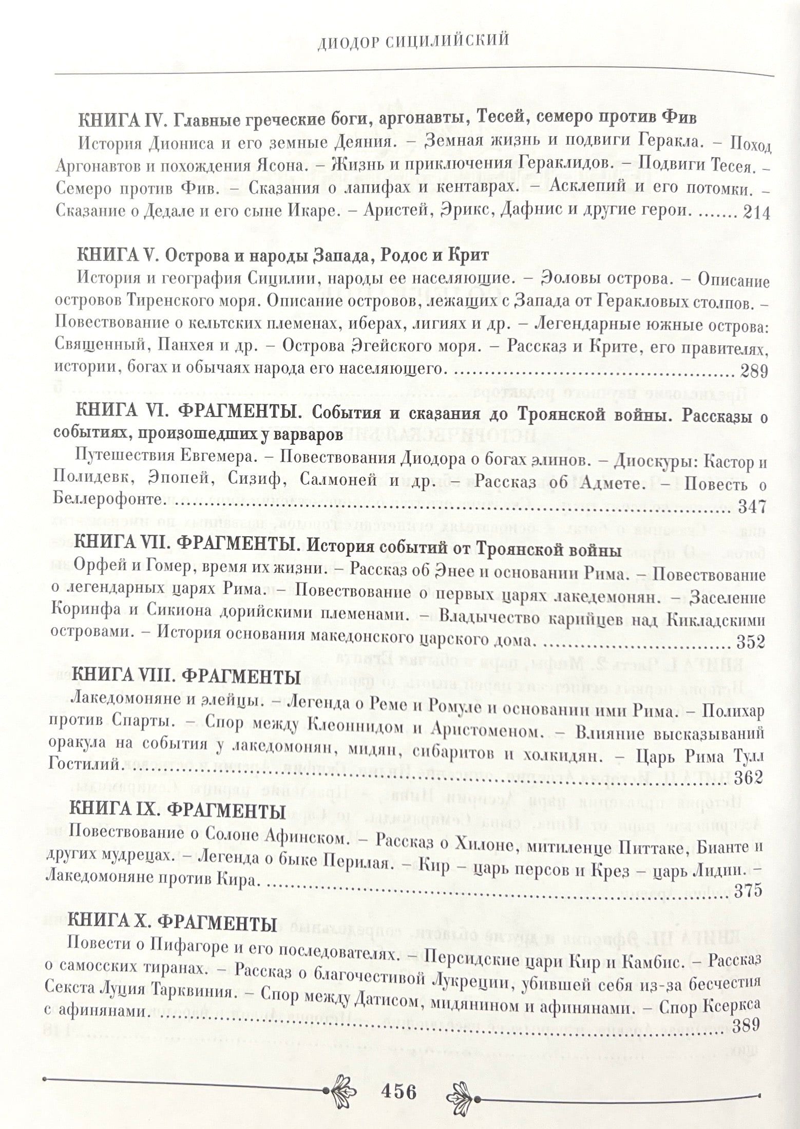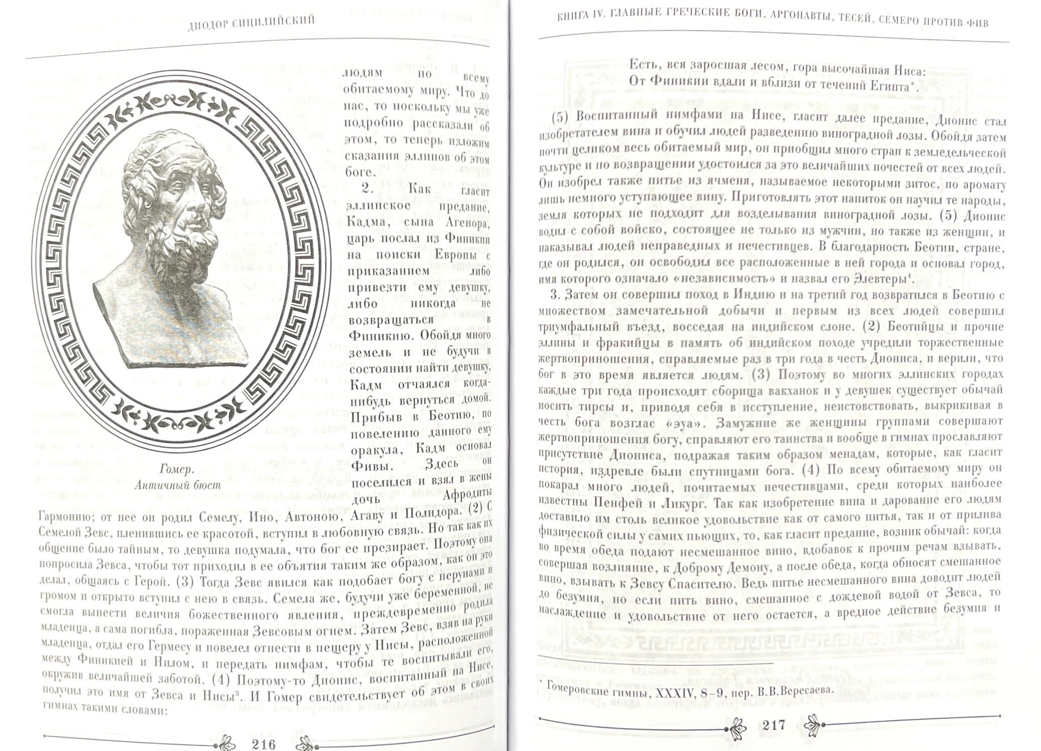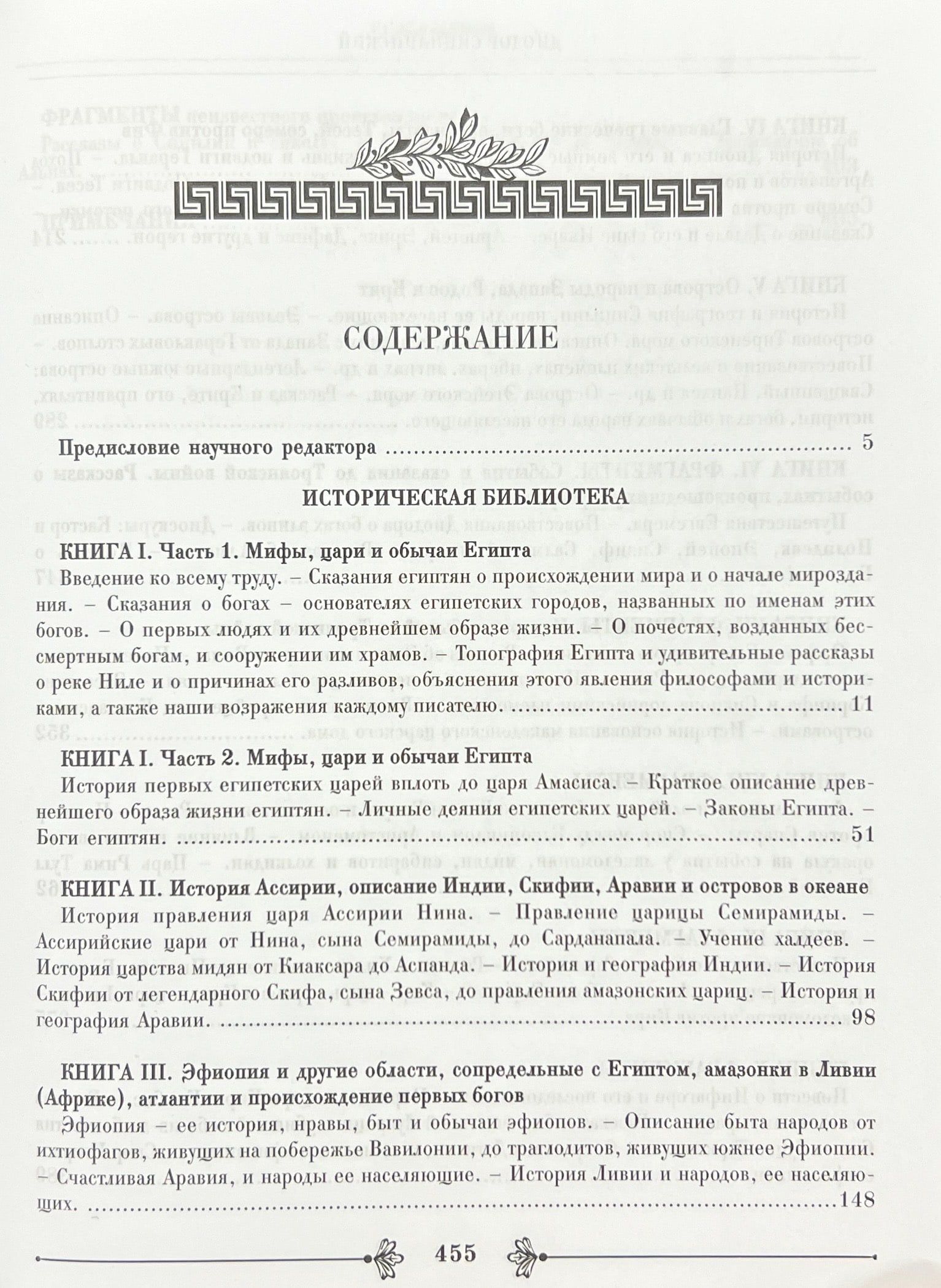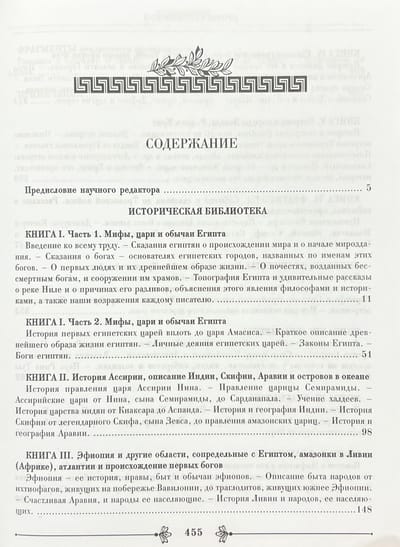 «Историческая библиотека» Диодора Сицилийского — одно из самых замечательных произведений классической древности. Автор, ученый грек родом из сицилийского городка Агирия, жил в I в. до н.э. и был современником окончательного сложения мировой Римской державы. Очевидно, это событие повлияло на замысел Диодора создать подробный обзор всей державы, включая страны Древнего Востока, Грецию и Рим, от самых древних истоков до своего времени, т.е. примерно до середины I в. до н.э. Своему произведению автор дал название «Историческая библиотека» с тем, чтобы подчеркнуть обилие и разнообразие положенных в его основу источников. Огромный по размерам труд Диодора подразделялся на 40 книг. Из них целиком сохранились только 15 (I-V, XI-XX), а от остальных дошли только фрагменты в виде цитат или переложений у более поздних античных и византийских писателей. Труд Диодора, ценный как своим собственно историческим повествованием, так и хорошо разработанной хронологией, составляет как бы хребет дошедшей от древности исторической традиции. В первыйтом нового русского перевода Диодора вошли первые десять книг «Исторической библиотеки», где сначала дается описание стран и народов Северной Африки (в первую очередь Египта), Переднего Востока, Индии и Скифии вместе с их мифологией и легендарной предисторией. Затем (с книги ГУ) автор переходит к греческому миру, перелагает мифы о греческих богах и героях и повествует о древнейшей истории греков от Троянской войны до похода на Грецию персидского царя Ксеркса (480 г. до н.э.).
