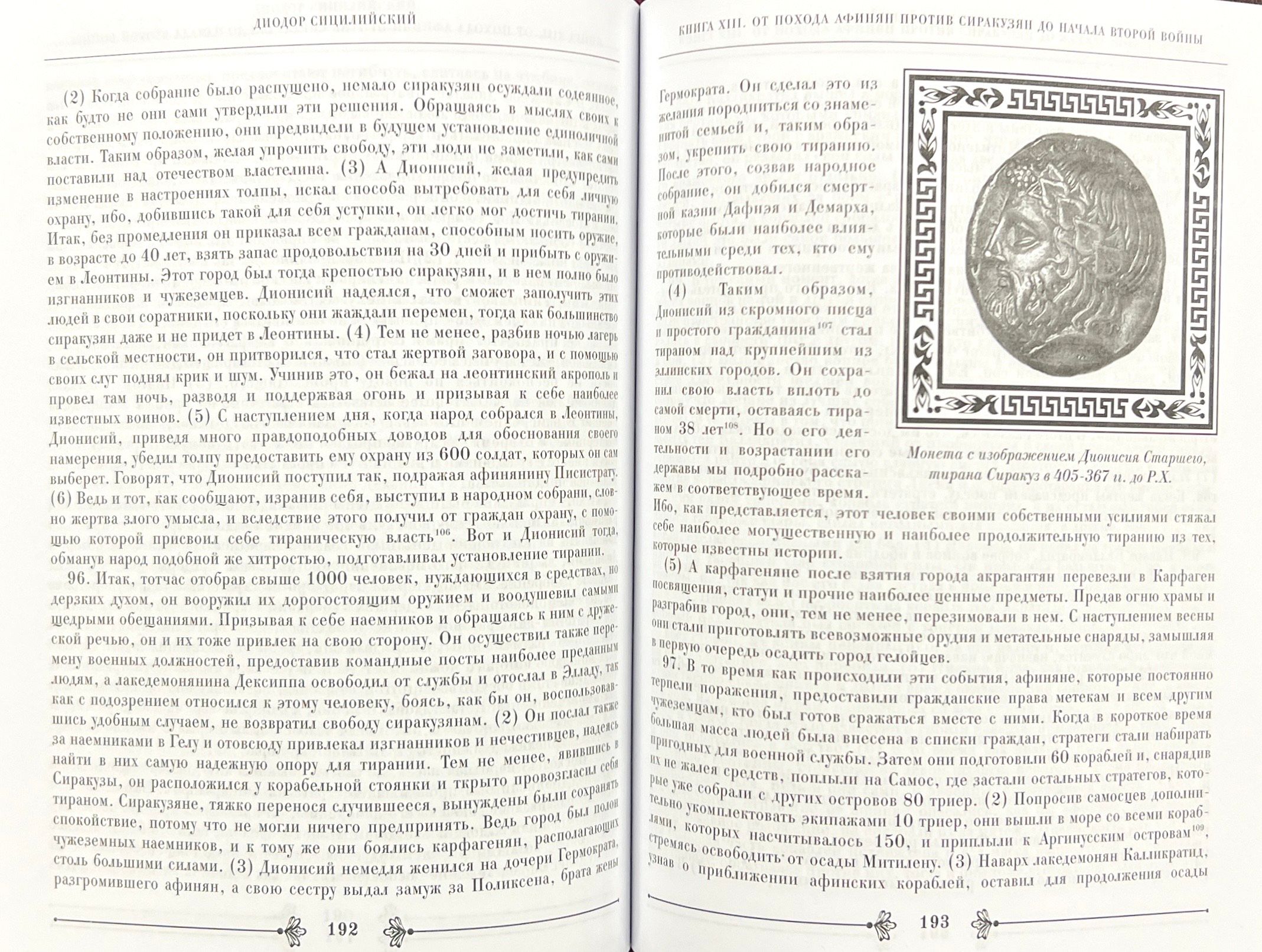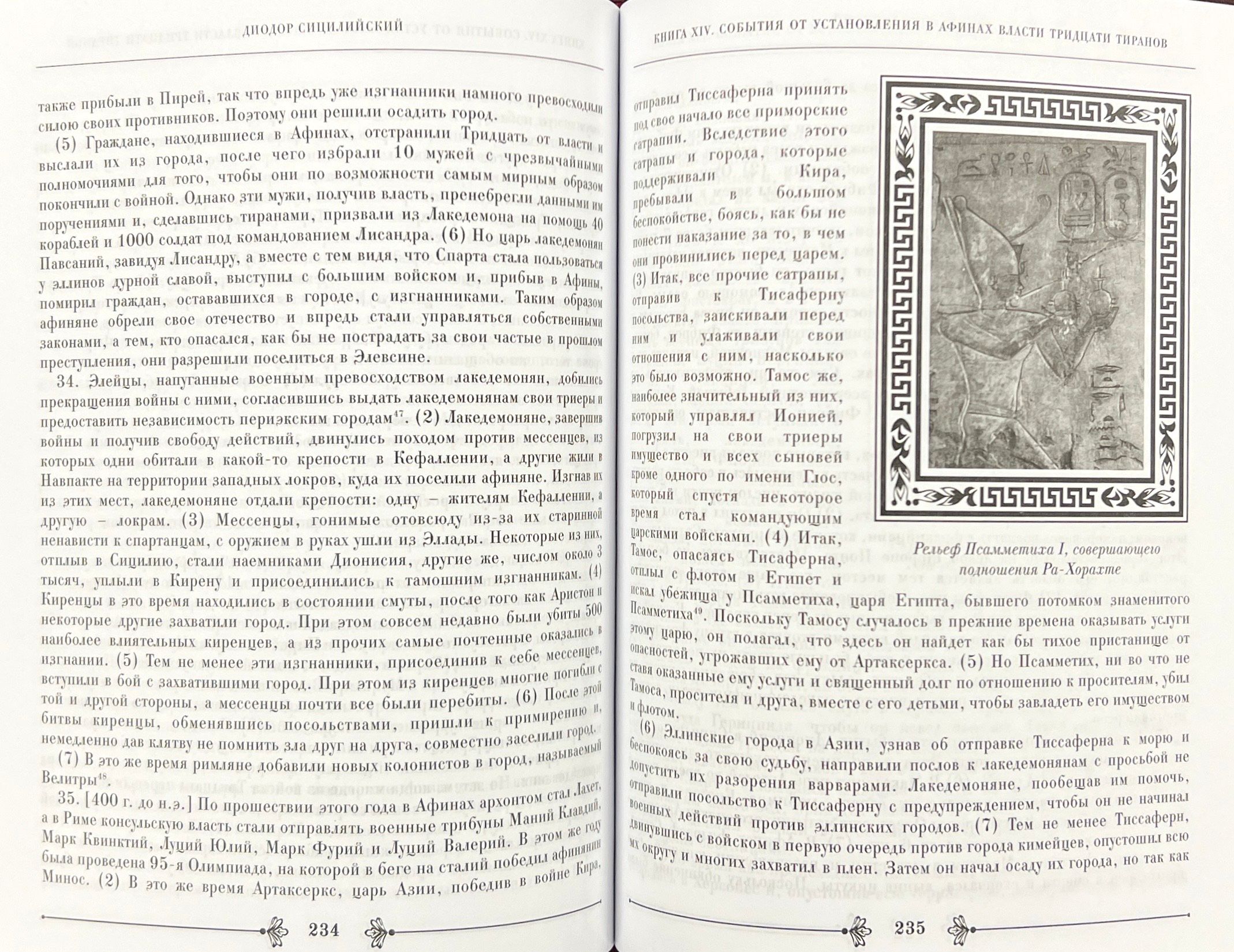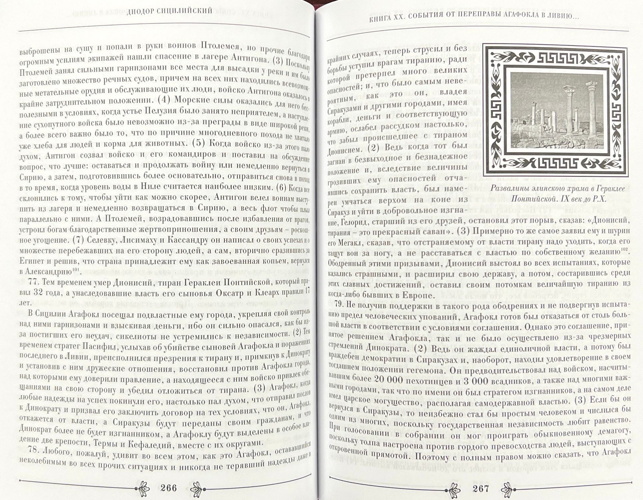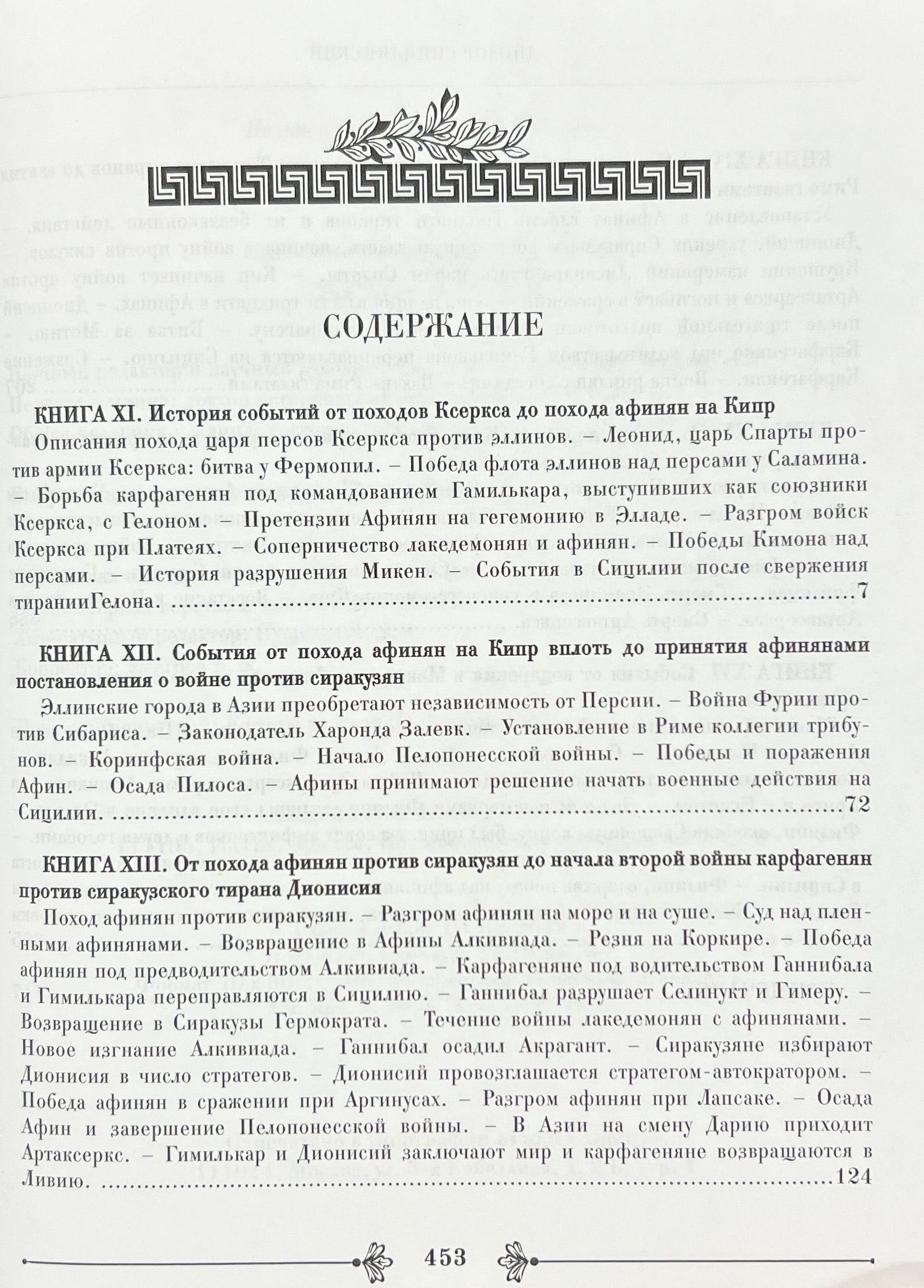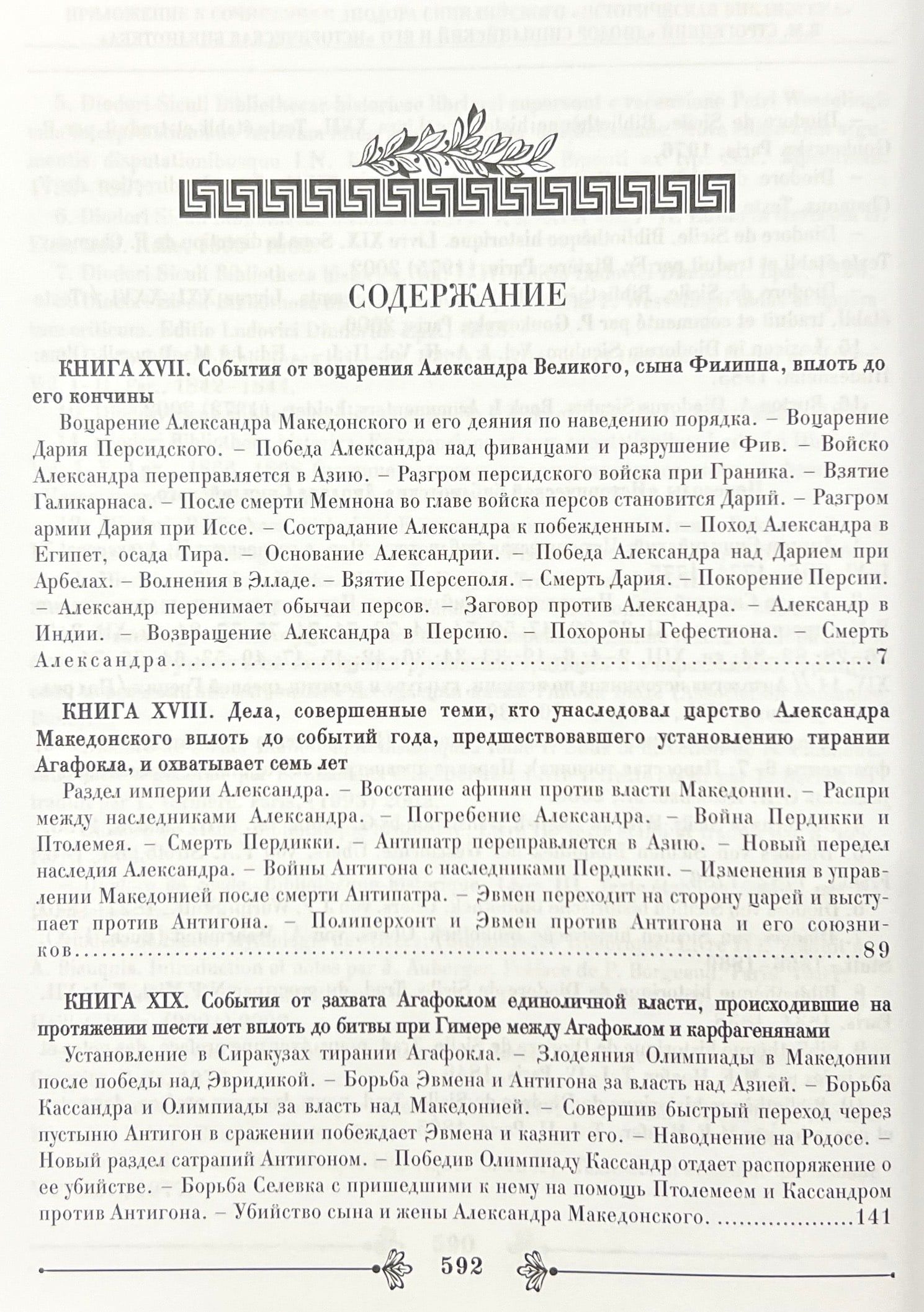 «Историческая библиотека» Диодора Сицилийского — одно из самых замечательных произведений классической древности. Автор, ученый грек родом из сицилийского городка Агирия, жил в I в. до н.э. и был современником окончательного сложения мировой Римской державы. Очевидно, это событие повлияло на замысел Диодора создать подробный обзор всей державы, включая страны Древнего Востока, Грецию и Рим, от самых древних истоков до своего времени, т.е. примерно до середины I в. до н.э. Своему произведению автор дал название «Историческая библиотека» с тем, чтобы подчеркнуть обилие и разнообразие положенных в его основу источников. Огромный по размерам труд Диодора подразделялся на 40 книг. Из них целиком сохранились только 15 (I-V, XI-XX), а от остальных дошли только фрагменты в виде цитат или переложений у более поздних античных и византийских писателей. Труд Диодора, ценный как своим собственно историческим повествованием, так и хорошо разработанной хронологией, составляет как бы хребет дошедшей от древности исторической традиции. В первыйтом нового русского перевода Диодора вошли первые десять книг «Исторической библиотеки», где сначала дается описание стран и народов Северной Африки (в первую очередь Египта), Переднего Востока, Индии и Скифии вместе с их мифологией и легендарной предисторией. Затем (с книги ГУ) автор переходит к греческому миру, перелагает мифы о греческих богах и героях и повествует о древнейшей истории греков от Троянской войны до похода на Грецию персидского царя Ксеркса (480 г. до н.э.).