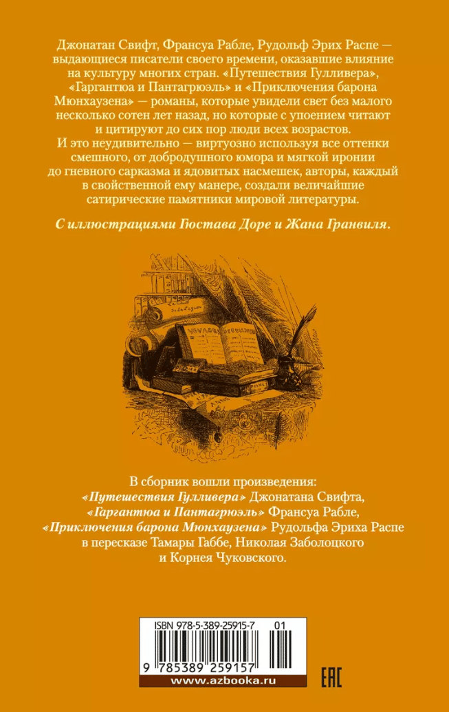 Джонатан Свифт, Франсуа Рабле, Рудольф Эрих Распе — выдающиеся писатели своего времени, оказавшие влияние на культуру многих стран. «Путешествия Гулливера», «Гаргантюа и Пантагрюэль» и «Приключения барона Мюнхаузена» — романы, которые увидели свет без малого несколько сотен лет назад, но которые с упоением читают и цитируют до сих пор люди всех возрастов. И это неудивительно — виртуозно используя все оттенки смешного, от добродушного юмора и мягкой иронии до гневного сарказма и ядовитых насмешек, авторы, каждый в свойственной ему манере, создали величайшие сатирические памятники мировой литературы. Истории о путешествиях хирурга, а затем капитана Лемюэля Гулливера, о семье обжор-великанов и весёлые похождения барона Мюнхаузена вдохновили французских художников Гюстава Доре и Жана Гранвиля на создание иллюстраций, впоследствии ставших классическими.