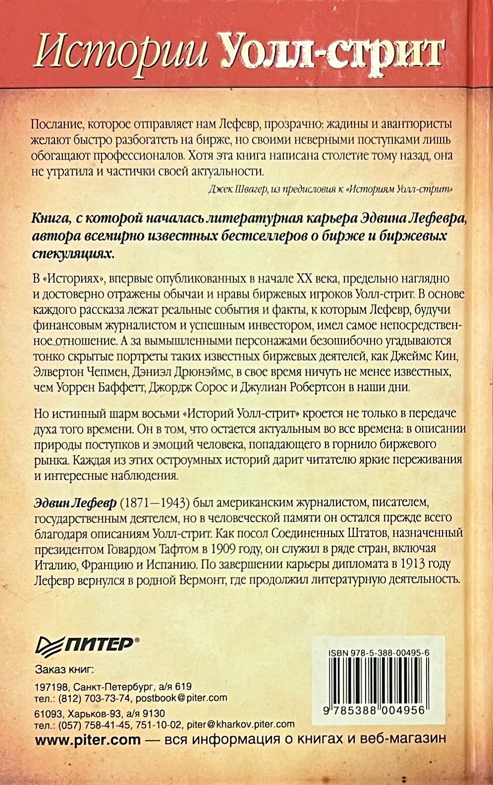 «‎Истории Уолл-стрит»‎ - книга, с которой началась литературная карьера Эдвина Лефевра, автора всемирно известных книг о бирже и биржевых спекуляциях. В «‎Историях»‎, впервые опубликованных в начале XX века, предельно наглядно и достоверно - как всегда у Лефевра - отражены обычаи и нравы биржевых игроков Уолл-стрит. В основе каждого рассказа лежат реальные события и факты, к которым Лефевр, будучи финансовым журналистом и успешным инвестором, имел самое непосредственное отношение. А за вымышленными персонажами безошибочно угадываются тонко скрытые портреты таких известных биржевых деятелей, как Джеймс Кин, Элвертон Чепмен, Дэниэл Дрюнэймс, в свое время ничуть не менее известных, чем Уоррен Баффетт, Джордж Сорос и Джулиан Робертсон в наши дни.