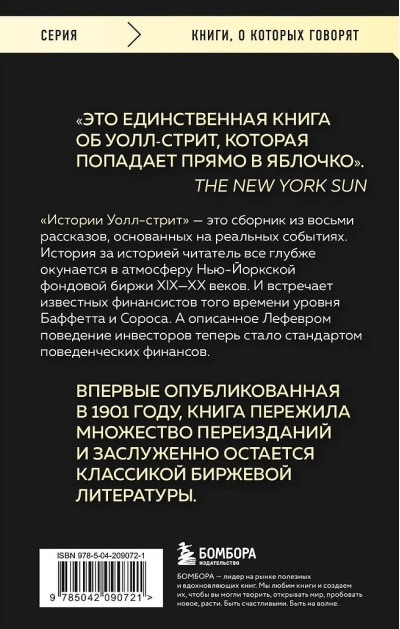«Истории Уолл-стрит» — это сборник из восьми рассказов, основанных на реальных событиях. История за историей читатель все глубже окунается в атмосферу Нью-Йоркской фондовой биржи XIX—XX веков. И встречает известных финансистов того времени уровня Баффетта и Сороса. А описанное Лефевром поведение инвесторов теперь стало стандартом поведенческих финансов.