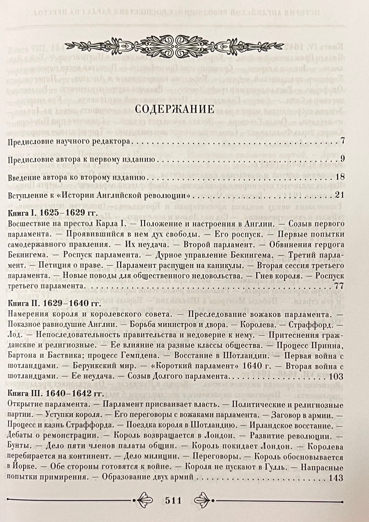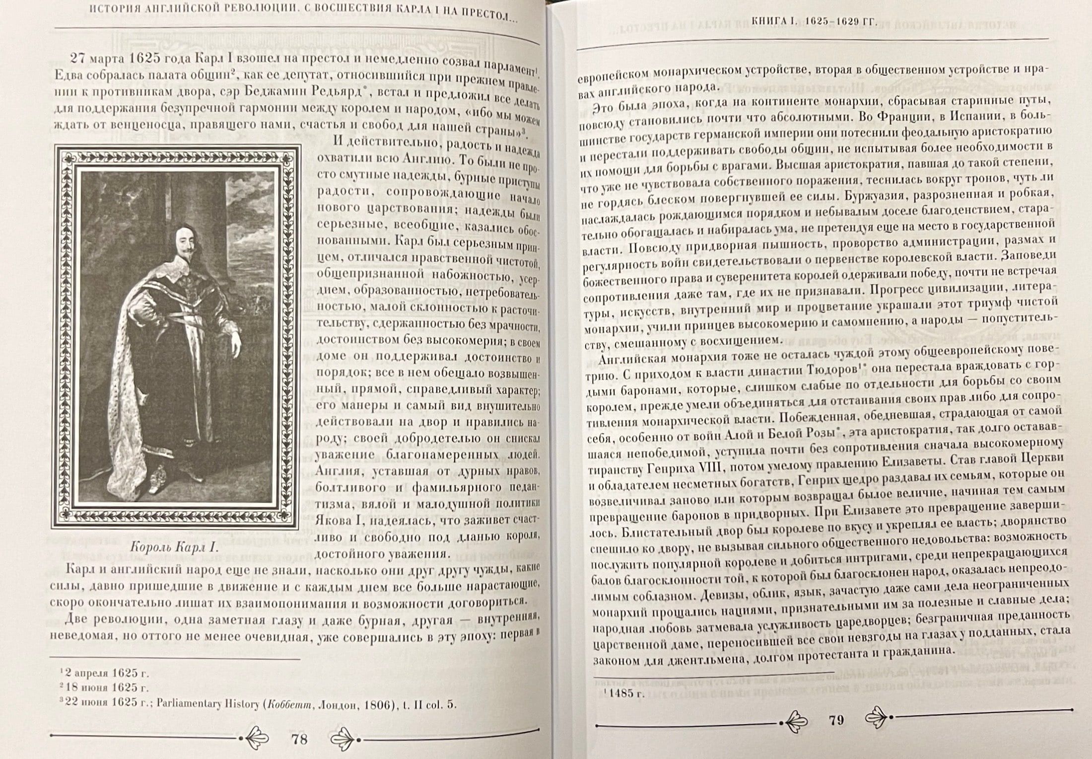 Первый том «Истории Английской революции» Франсуа Гизо содержит описание событий, произошедших в период царствования короля Карла I Стюарта (1625-1649). Книги I-III охватываю время, предшествующее началу гражданской войны в Англии, книги IV-VI – т.н. «первую гражданскую войну» (1642-1646). В книге VII излагаются политические события 1646-1648 гг. Книга VIII включает в себя описание «второй гражданской войны» (1648-1649), суда над Карлом I и его казни. Изложению исторических событий предпосланы два предисловия Гизо к первому (1826-1827) и второму изданию (1841) «История Английской революции», а также историчесике документы, собранные самим Гизо, и непосредственно относящиеся ко времени описываемых событий.