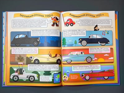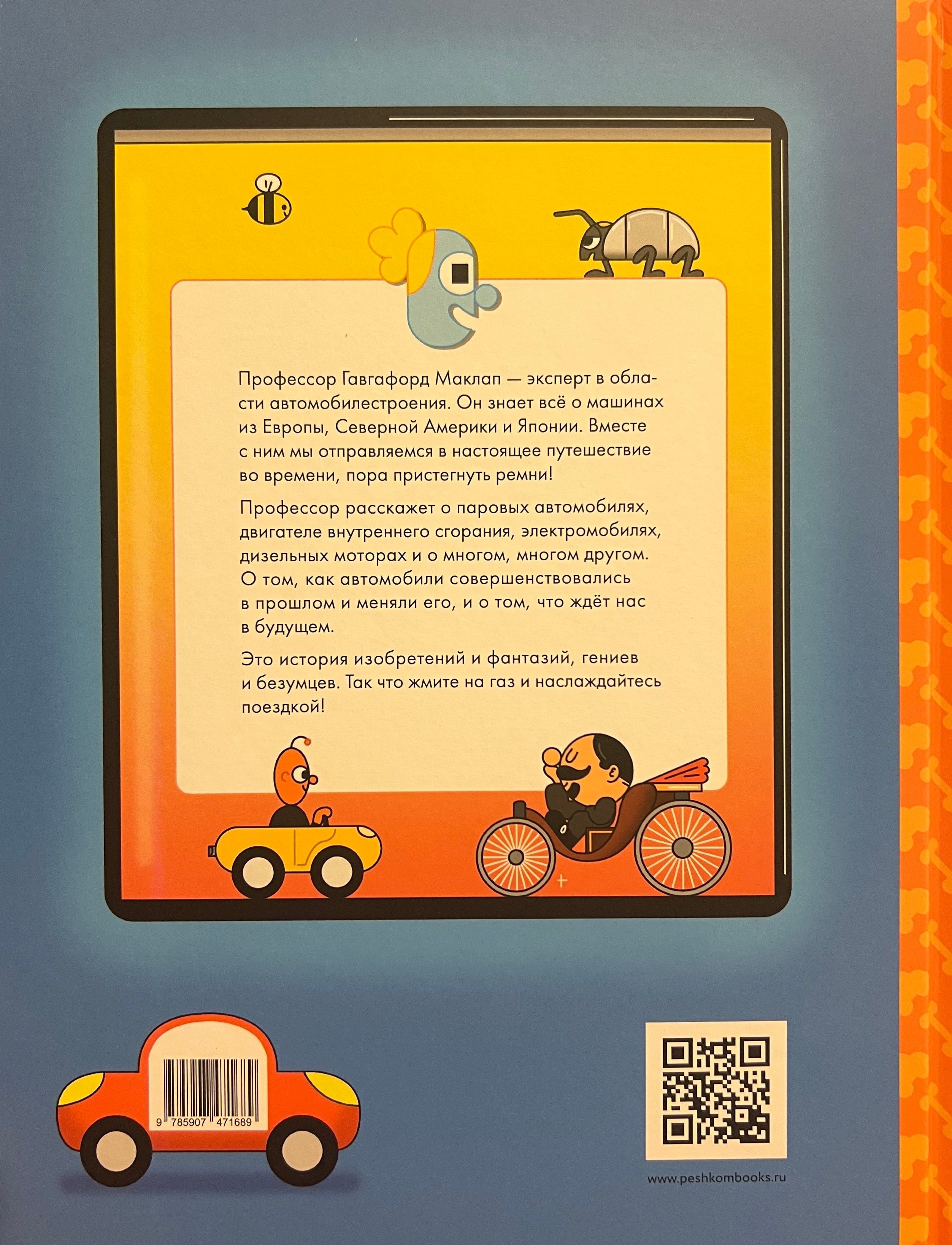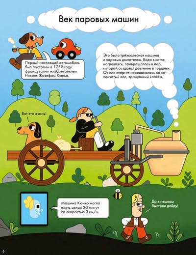 С древнейших времён людям хотелось создать самодвижущую повозку. Сначала на пружинах, затем на ветре и парусах, наконец, на пару, электрической тяге и бензине. Вместе с профессором Гавгафордом Маклапом и его друзьями, Машинкой и Кнопкой, мы изучим «Историю автомобиля в комиксах», узнаем про известные машины, устройство двигателя, типы автомобилей, о том, кто и зачем придумал автогонки, а также посмотрим, можно ли создать безвредную для окружающего мира машину. Например, знаете ли вы, что на сборку первого массового автомобиля — знаменитого «Форда» модели Т уходило всего 1,5 часа и стоил он 260 долларов, что было по карману даже небогатым? А доводилось ли вам видеть трёхколёсные машины и такие, которые умеют и ездить по суше, и плавать по воде? В книге есть не только интересные факты, но и пара секретных заданий, которые сможет выполнить только внимательный читатель.