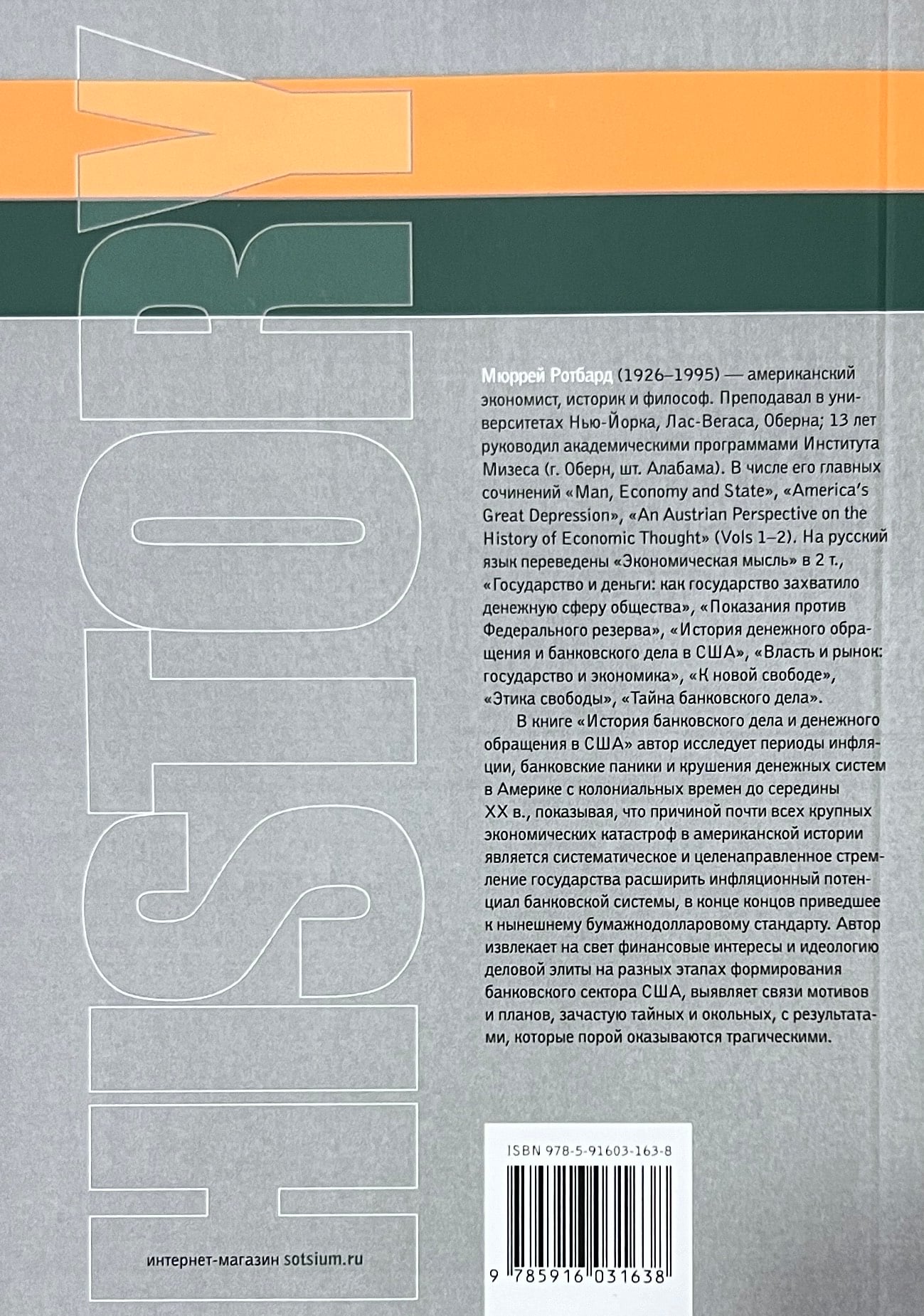 В книге «История банковского дела и денежного обращения в США» автор исследует периоды инфляции, банковские паники и крушения денежных систем в Америке с колониальных времен до середины ХХ в., показывая, что причиной почти всех крупных экономических катастроф в американской истории является систематическое и целенаправленное стремление государства расширить инфляционный потенциал банковской системы, в конце концов приведшее к нынешнему бумажно‑долларовому стандарту. Автор извлекает на свет финансовые интересы и идеологию деловой элиты на разных этапах формирования банковского сектора США, выявляет связи мотивов и планов, зачастую тайных и окольных, с результатами, которые порой оказываются трагическими.