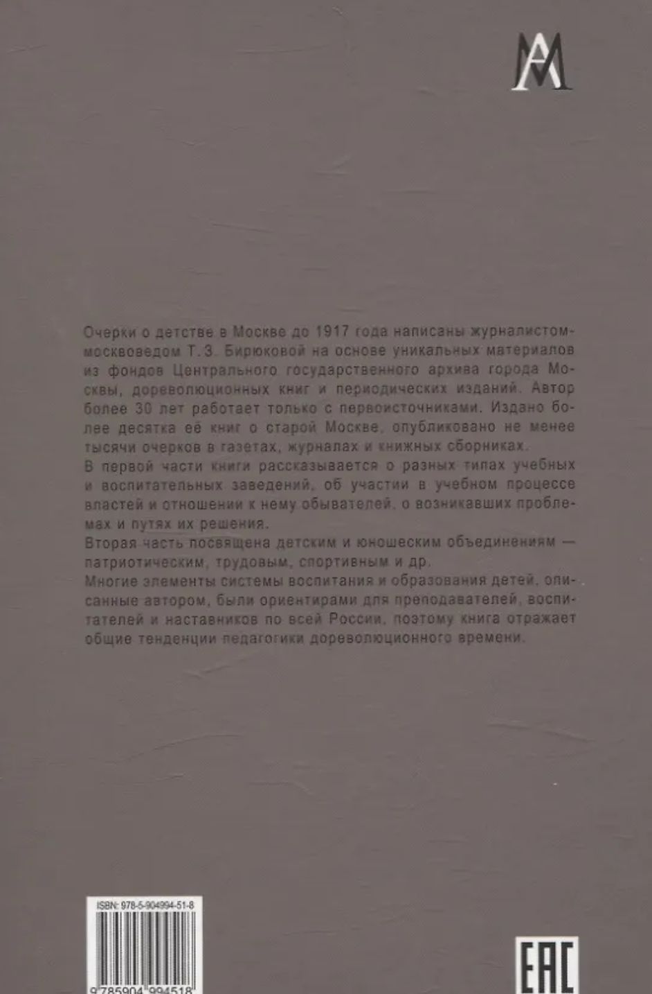 Очерки о детстве в Москве до 1917 года написаны журналистом-москвоведом Т.З. Бирюковой на основе уникальных материалов из фондов Центрального государственного архива города Москвы, дореволюционных книг и периодических изданий. Автор более 30 лет работает только с первоисточниками. Издано более десятка её книг о старой Москве, опубликовано не менее тысячи очерков в газетах, журналах и книжных сборниках. Многие элементы системы воспитания и образования детей, описанные автором, были ориентирами для преподавателей, воспитателей и наставников по всей России, поэтому книга отражает общие тенденции педагогики дореволюционного времени.