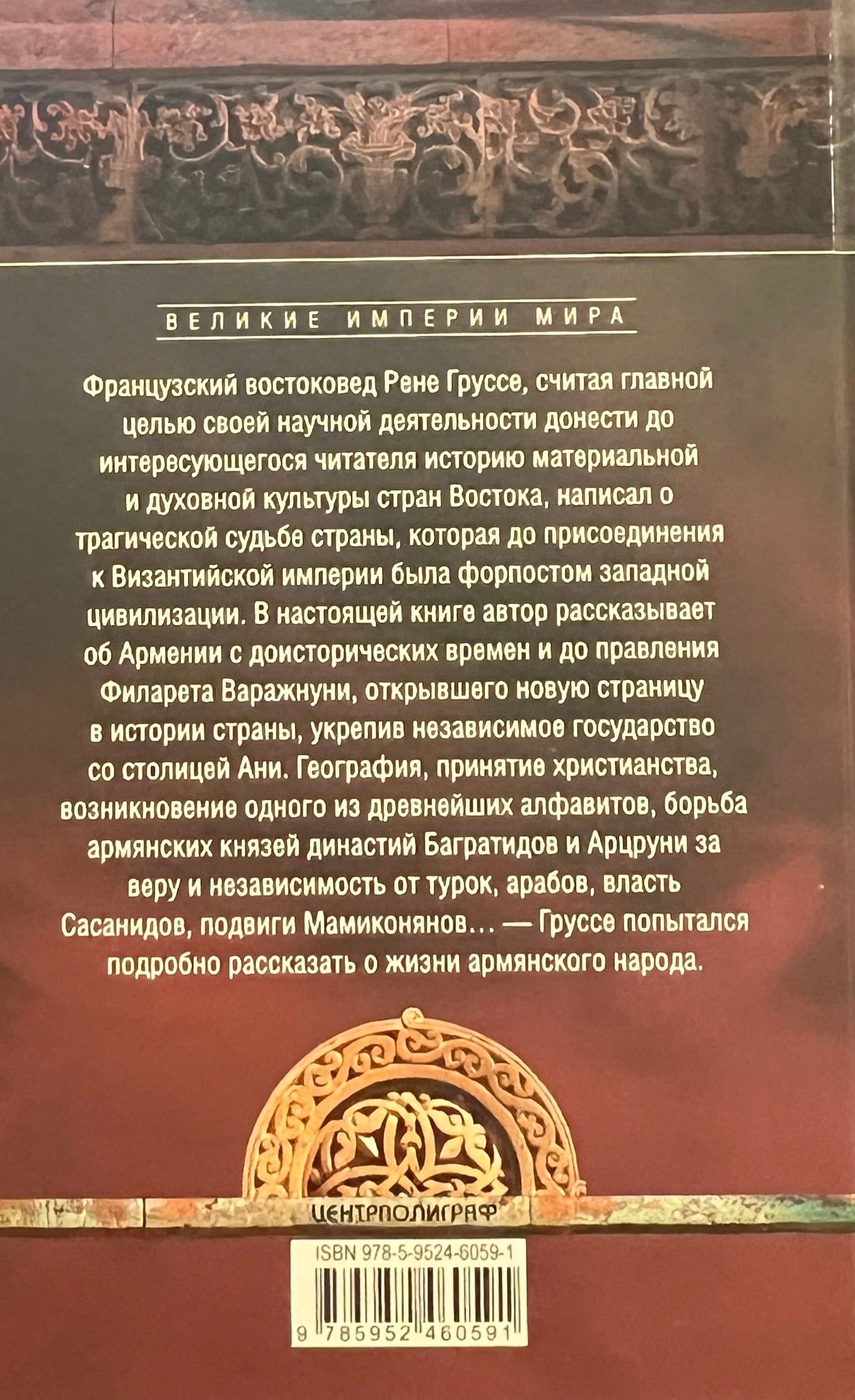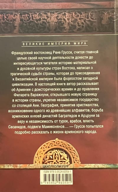 Французский востоковед Рене Груссе, считая главной целью своей научной деятельности донести до интересующегося читателя историю материальной и духовной культуры стран Востока, написал о трагической судьбе страны, которая до присоединения к Византийской империи была форпостом западной цивилизации. В настоящей книге автор рассказывает об Армении с доисторических времен и до правления Филарета Варажнуни, открывшего новую страницу в истории страны, укрепив со столицей Ани независимое государство. География, принятие христианства, возникновение одного из древнейших алфавитов, борьба армянских князей династий Багратидов и Арцруни за веру и независимость от турок, арабов, власть Сасанидов, подвиги Мамиконянов… — Груссе попытался подробно рассказать о жизни армянского народа.