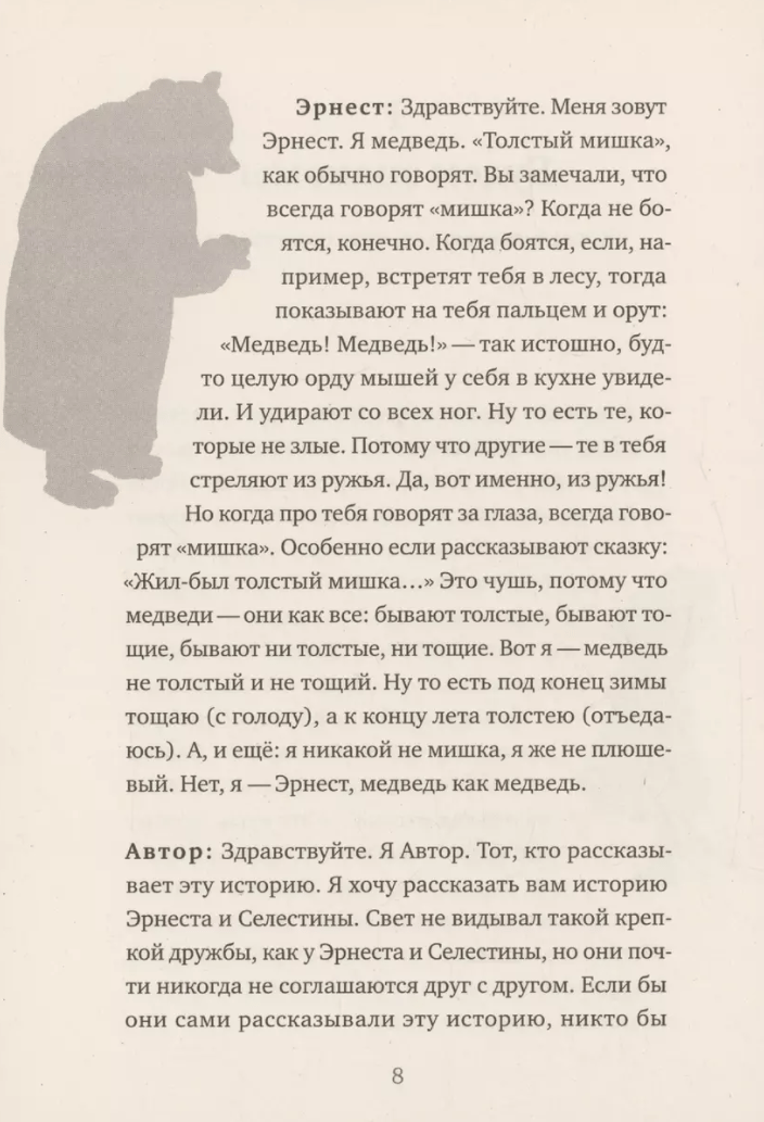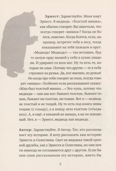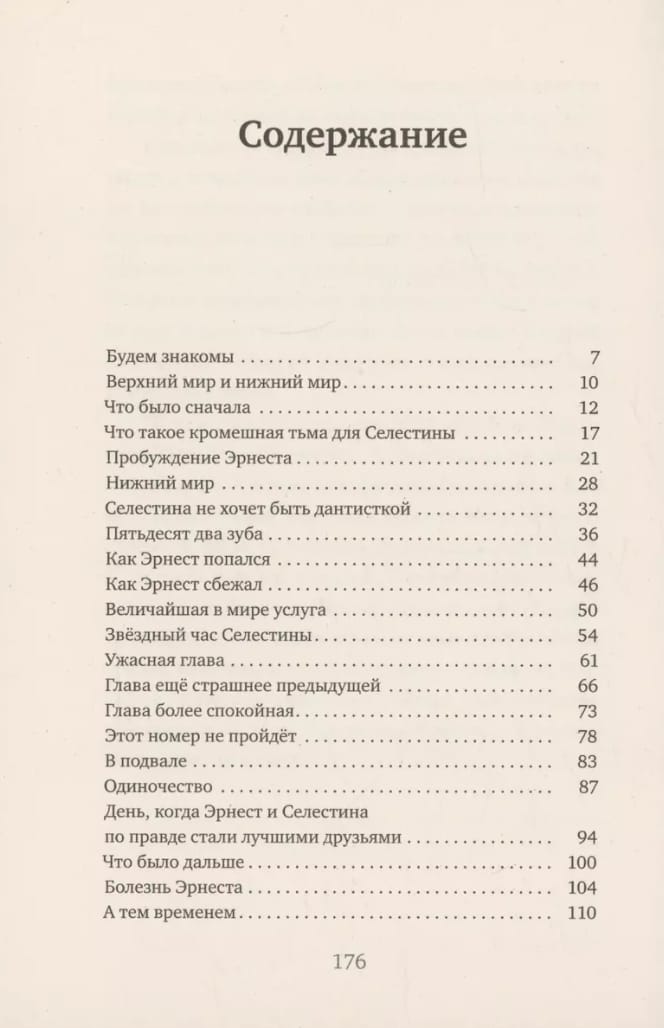 Альбомы Венсан вдохновили Пеннака на создание сценария анимационного фильма, который был номинирован на премию «Оскар» и получил премию «Сезар». Вслед за фильмом в 2012 году появилась и книга, которую вы держите в руках, — «История Эрнеста и Селестины». Это настоящий роман с пронзительной социальной повесткой: о вопиющем неравенстве в обществе и возможности найти родную душу вопреки запретам и предрассудкам.
