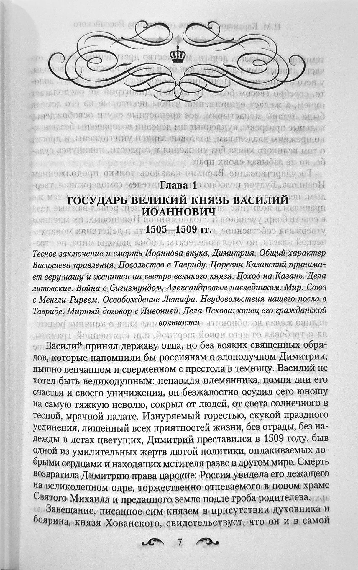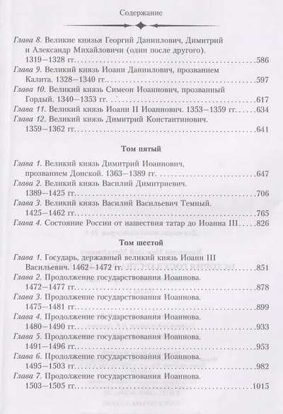 В книгу I вошли первые шесть томов, рассказывающие о событиях, происходящих на территории России с момента первых упоминаний о славянах и до 1505 года — окончания времени правлении государя, державного великого князя Иоанна III Васильевича.