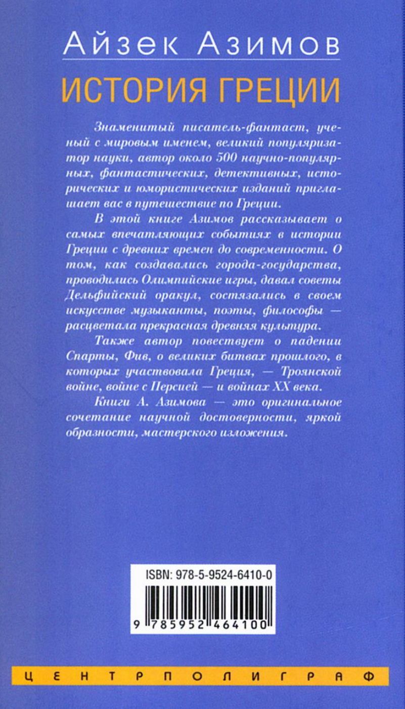 В этой книге Азимов рассказывает о самых впечатляющих событиях в истории Греции с древних времен до современности. О том, как создавались города-государства, проводились Олимпийские игры, давал советы Дельфийский оракул, состязались в своем искусстве музыканты, поэты, философы — расцветала прекрасная древняя культура. Также автор повествует о падении Спарты, Фив, о великих битвах прошлого, в которых участвовала Греция, — Троянской войне, войне с Персией — и войнах ХХ века.