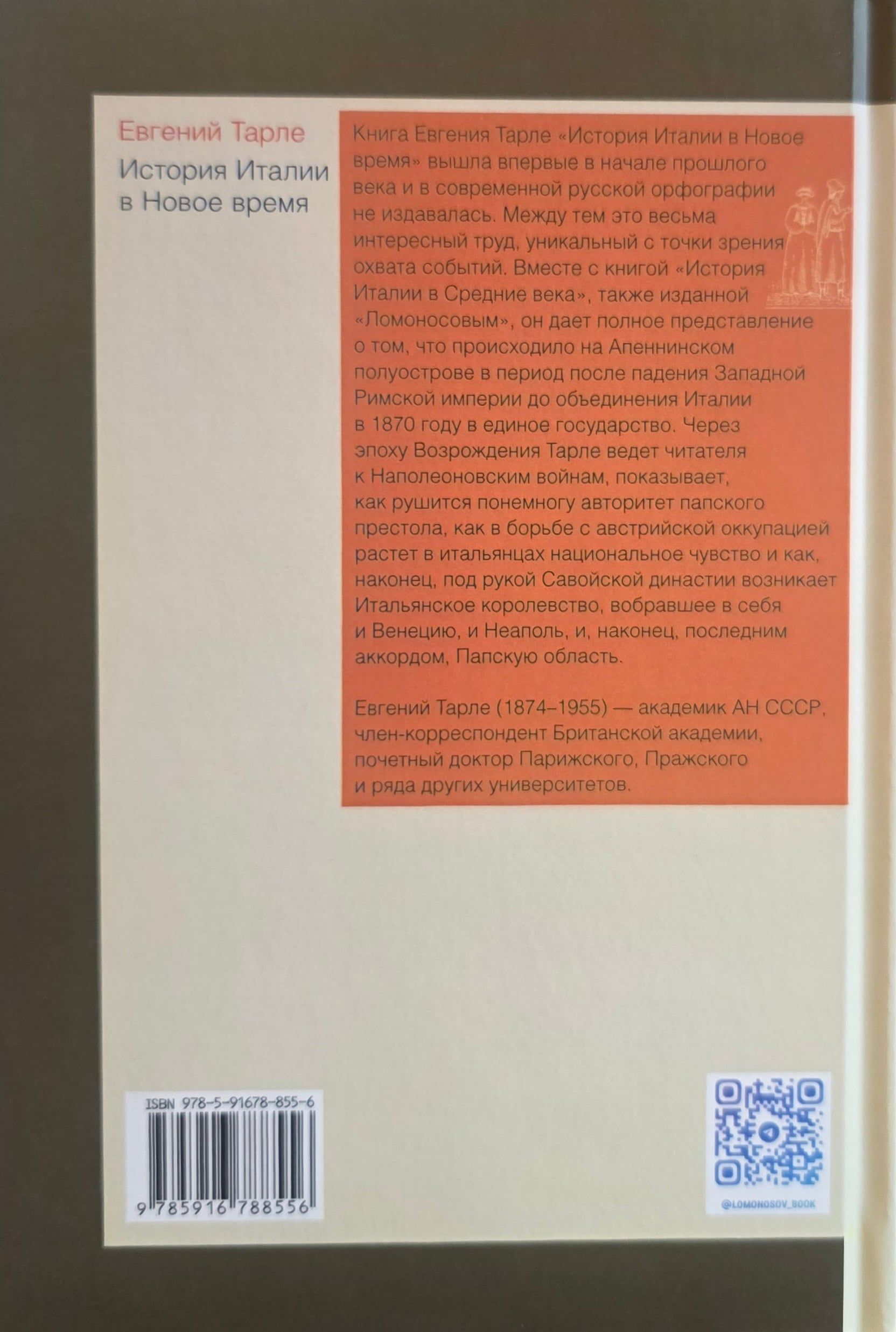Книга Евгения Тарле «История Италии в Новое время» вышла впервые в начале прошлого века и в современной русской орфографии не издавалась. Между тем это весьма интересный труд, уникальный с точки зрения охвата событий. Вместе с книгой «История Италии в Средние века», также изданной «Ломоносовым», он дает полное представление о том, что происходило на Апеннинском полуострове в период после падения Западной Римской империи до объединения Италии в 1870 году в единое государство. Через эпоху Возрождения Тарле ведет читателя к Наполеоновским войнам, показывает, как рушится понемногу авторитет папского престола, как в борьбе с австрийской оккупацией растет в итальянцах национальное чувство и как, наконец, под рукой Савойской династии возникает Итальянское королевство, вобравшее в себя и Венецию, и Неаполь, и, наконец, последним аккордом, Папскую область.