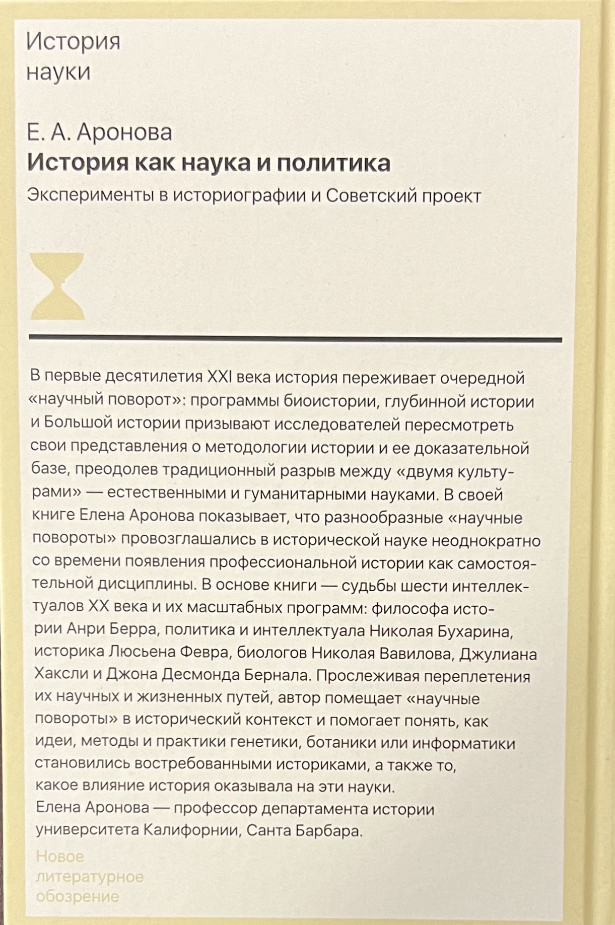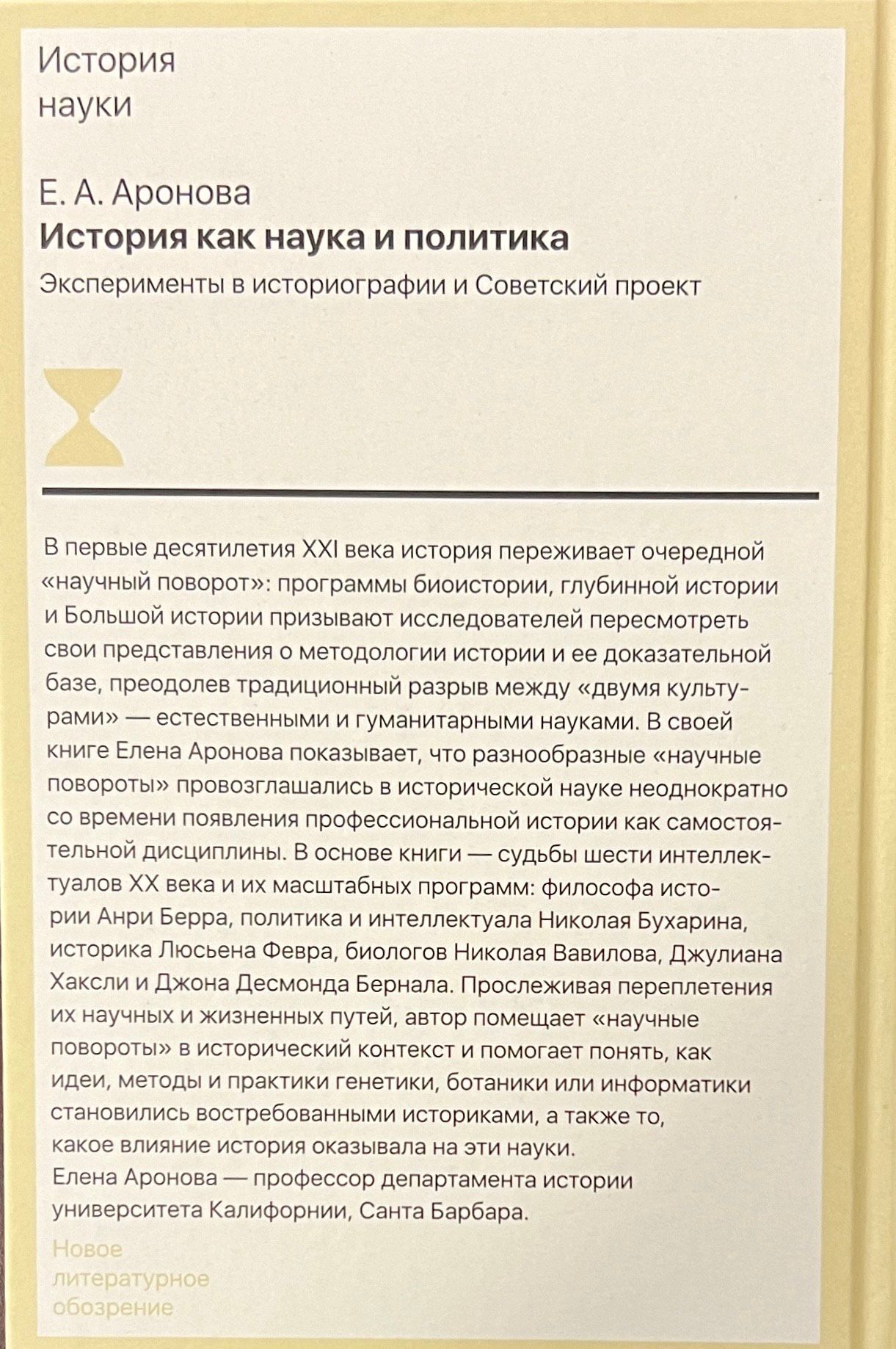 В основе книги — судьбы шести интеллектуалов ХX века и их масштабных программ: философа истории Анри Берра, политика и интеллектуала Николая Бухарина, историка Люсьена Февра, биологов Николая Вавилова, Джулиана Хаксли и Джона Десмонда Бернала. Прослеживая переплетения их научных и жизненных путей, автор помещает «научные повороты» в исторический контекст и помогает понять, как идеи, методы и практики генетики, ботаники или информатики становились востребованными историками, а также то, какое влияние история оказывала на эти науки. Елена Аронова — профессор департамента истории университета Калифорнии, Санта Барбара.