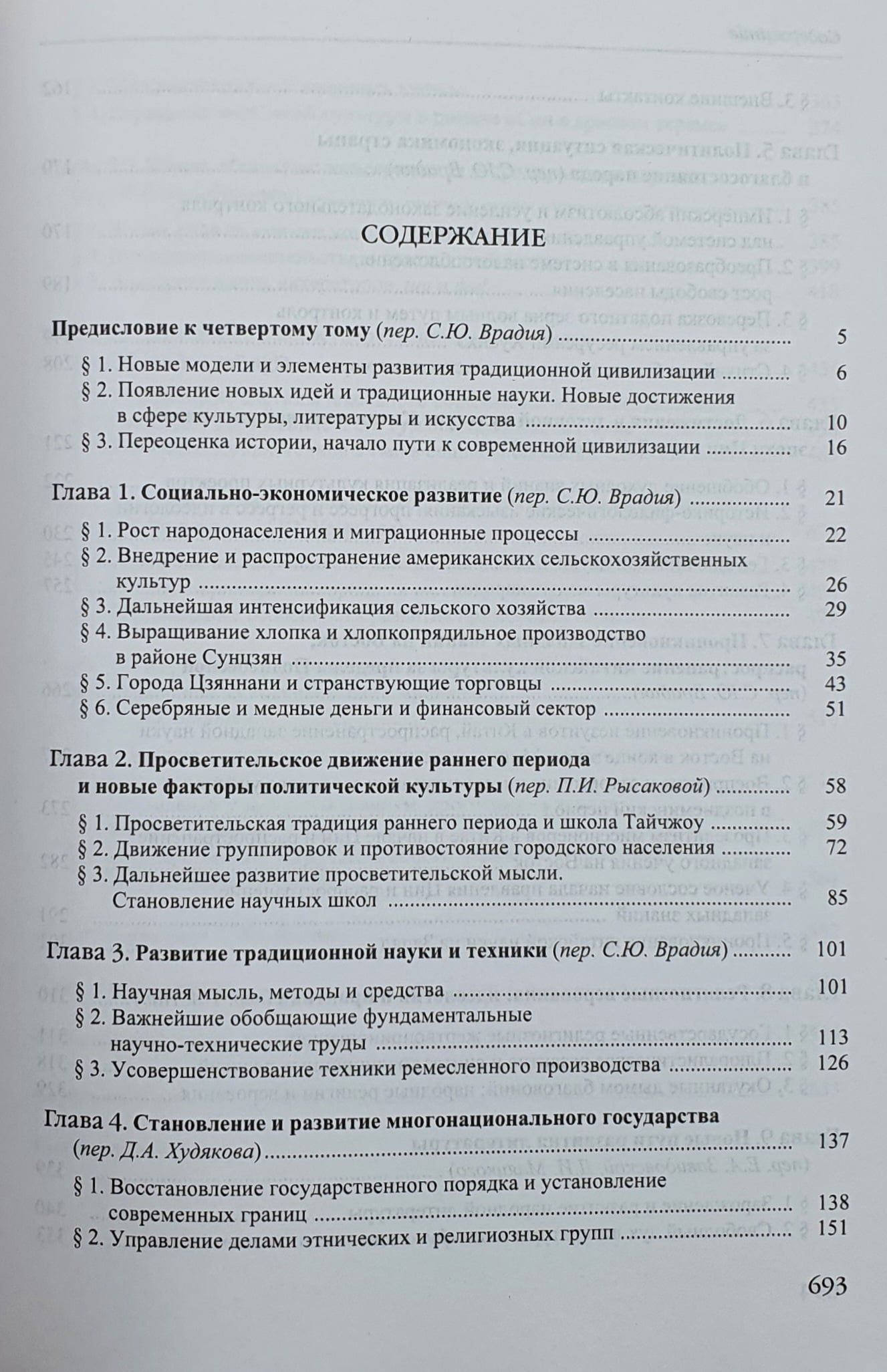 Четвертый том «Истории китайской цивилизации» охватывает заключительный период истории династии Мин, когда Китай, являвшийся передовой мировой державой в области науки, техники и культуры, стал проводить политику изоляции, и весь период правления маньчжурской династии Цин, закончившийся свержением монархии и провозглашением Китайской Республики.