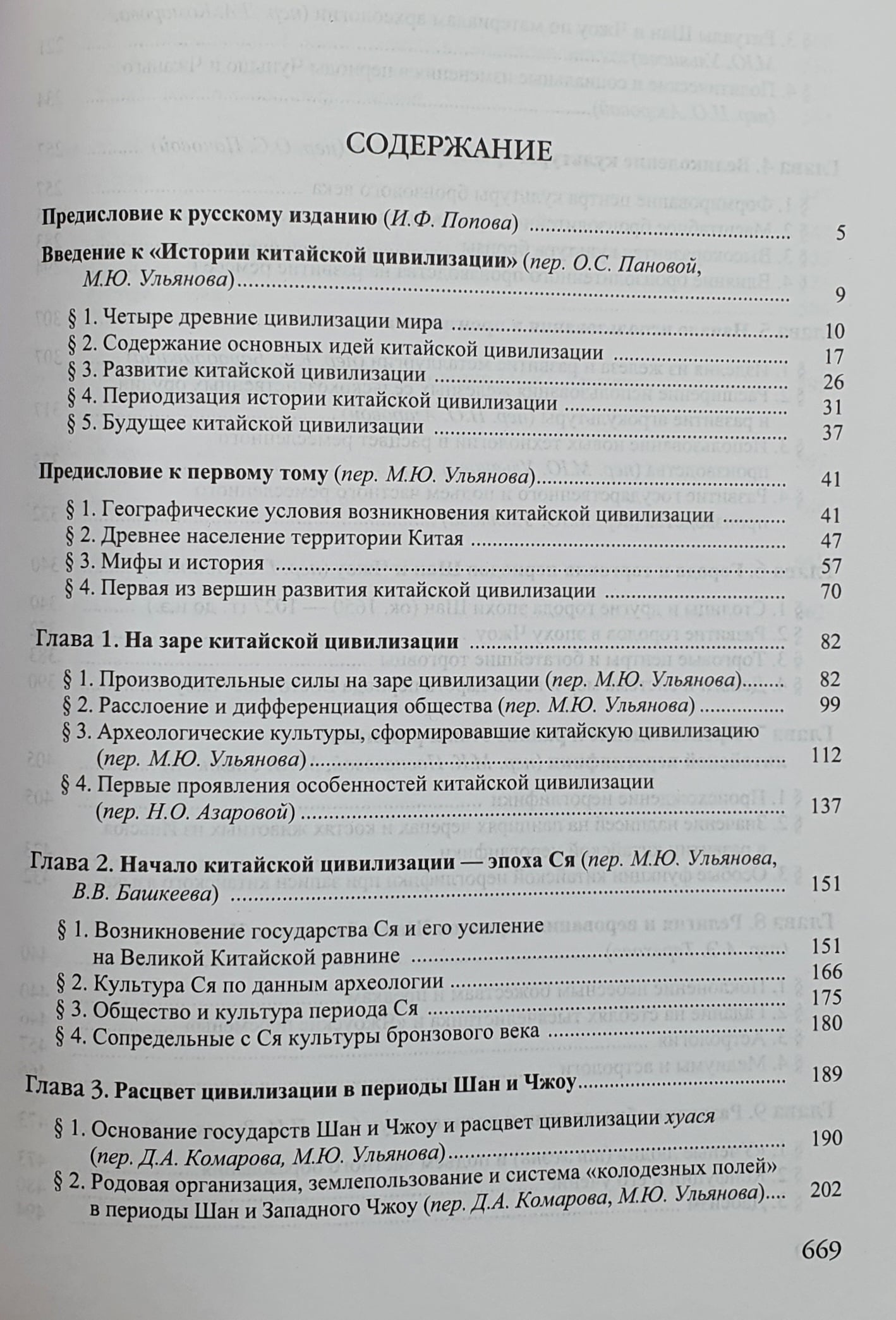 Первый том «Истории китайской цивилизации» посвящен времени до образования империи Цинь (периоды неолита, бронзы и раннего железа, эпохи Ся, Шан и Чжоу) и основан на изучении и сопоставлении письменных (в том числе недавно найденных) и археологических источников.