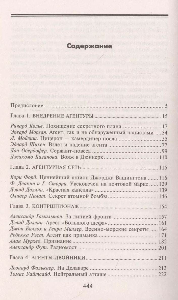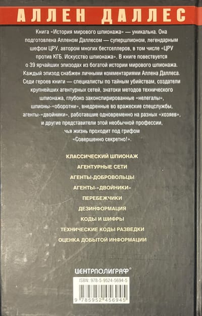 Книга составлена Алленом Даллесом — супершпионом, легендарным шефом ЦРУ, автором многих бестселлеров, в том числе «ЦРУ против КГБ. Искусство шпионажа». В книге повествуется о 39 ярчайших эпизодах из богатой истории мирового шпионажа. Каждый эпизод снабжен личными комментариями Аллена Даллеса. Среди героев книги — специалисты по тайным убийствам, создатели крупнейших агентурных сетей, знатоки методов технического шпионажа, «нелегалы», шпионы­-«оборотни», агенты­-«двойники» и другие представители этой необычной профессии, чья жизнь проходит под грифом «Совершенно секретно!».