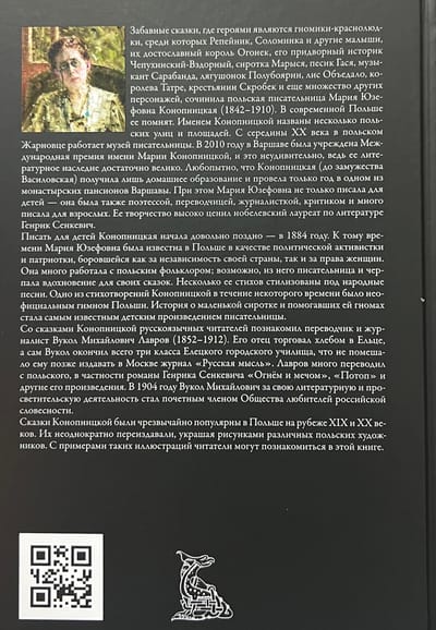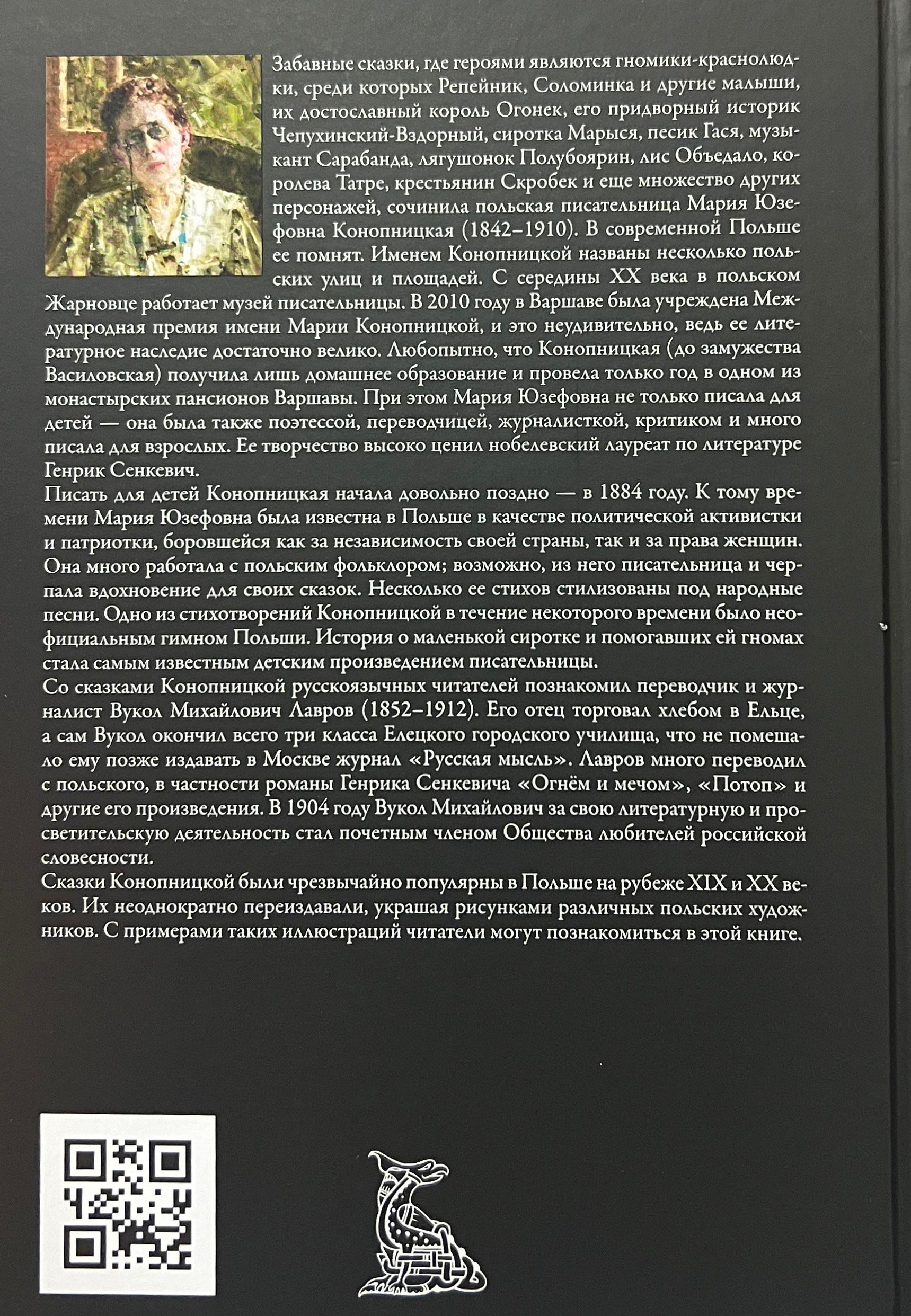 Мария Юзефовна Конопницкая (1842–1910) — польская писательница, переводчица и литературный критик. «История о гномах и о сиротке Марысе» является ее наиболее известным произведением для детей. В ней маленькие подземные волшебники помогают девочке найти своих пропавших гусей. Текст сказки дан в переводе Вукола Михайловича Лаврова. Издание украшают цветные и черно-белые иллюстрации польских художников.