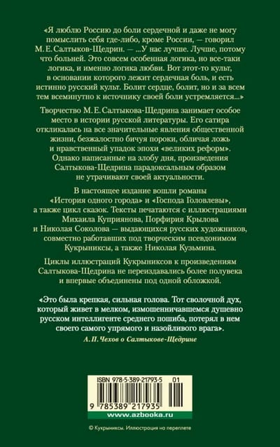 Творчество М. Е. Салтыкова-Щедрина занимает особое место в истории русской литературы. Его сатира откликалась на все значительные явления общественной жизни, безжалостно бичуя пороки, обличая ложь и нравственный упадок эпохи «великих реформ». Однако написанные на злобу дня, произведения Салтыкова-Щедрина парадоксальным образом не утрачивают своей актуальности. В настоящее издание вошли романы «История одного города» и «Господа Головлевы», а также сказки. Тексты печатаются с иллюстрациями Михаила Куприянова, Порфирия Крылова и Николая Соколова — выдающихся русских художников, совместно работавших под творческим псевдонимом Кукрыниксы, а также Николая Кузьмина.