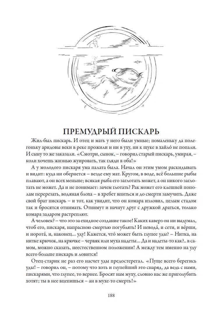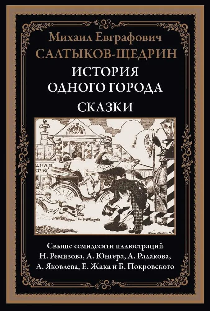 Знаменитый сатирический роман-хроника «История одного города» М. Е. Салтыкова-Щедрина в этом издании проиллюстрирован портретами глуповских градоначальников, выполненных Николаем Ремизовым, Александром Юнгером, Алексеем Радаковым и Александром Яковлевым; впервые эти блестящие рисунки были опубликованы в 1907 г. отдельным альбомом. Издание включает также девятнадцать сказок Салтыкова-Щедрина, в том числе такие известные как «Премудрый пескарь» и «Карась-идеалист». Рисунки к сказкам выполнены Евгением Жаком и Борисом Покровским.