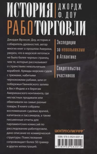 Джордж Фрэнсис Доу, историк и собиратель древностей, автор многих книг о прошлом Америки, уверен, что в морской летописи не было более черных страниц, чем те, которые рассказывают о странствиях невольничьих кораблей. Все морские суда с трюмами, набитыми чернокожими рабами, захваченными во время племенных войн или похищенными в мирное время, направлялись от побережья Гвинейского залива в Вест-Индию, в американские колонии, ставшие Соединенными Штатами, где несчастных продавали или обменивали на самые разные товары. В книге собраны воспоминания судовых врачей, капитанов и пассажиров, а также письменные отчеты для парламентских комиссий по расследованию работорговли, дано описание ее коммерческой структуры. Повествование сопровождает более 50 гравюр и других иллюстраций.