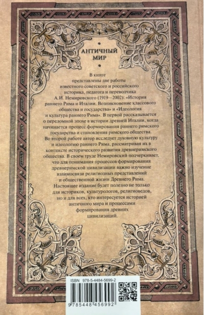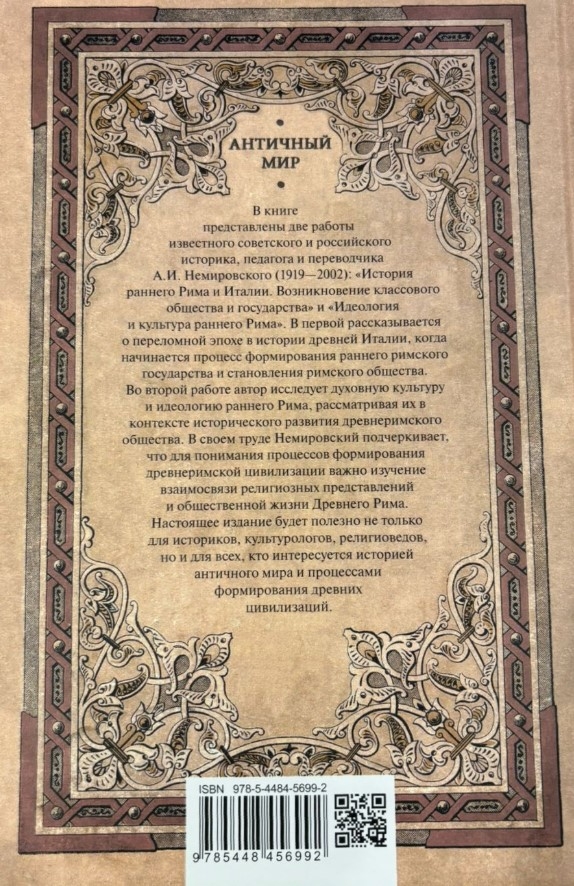 В книге представлены две работы известного советского и российского историка, педагога и переводчика А.И. Немировского (1919—2002): «История раннего Рима и Италии. Возникновение классового общества и государства» и «Идеология и культура раннего Рима». В первой рассказывается о переломной эпохе в истории древней Италии, когда начинается процесс формирования раннего римского государства и становления римского общества. Во второй работе автор исследует духовную культуру и идеологию раннего Рима, рассматривая их в контексте исторического развития древнеримского общества. В своем труде Немировский подчеркивает, что для понимания процессов формирования древнеримской цивилизации важно изучение взаимосвязи религиозных представлений и общественной жизни Древнего Рима.