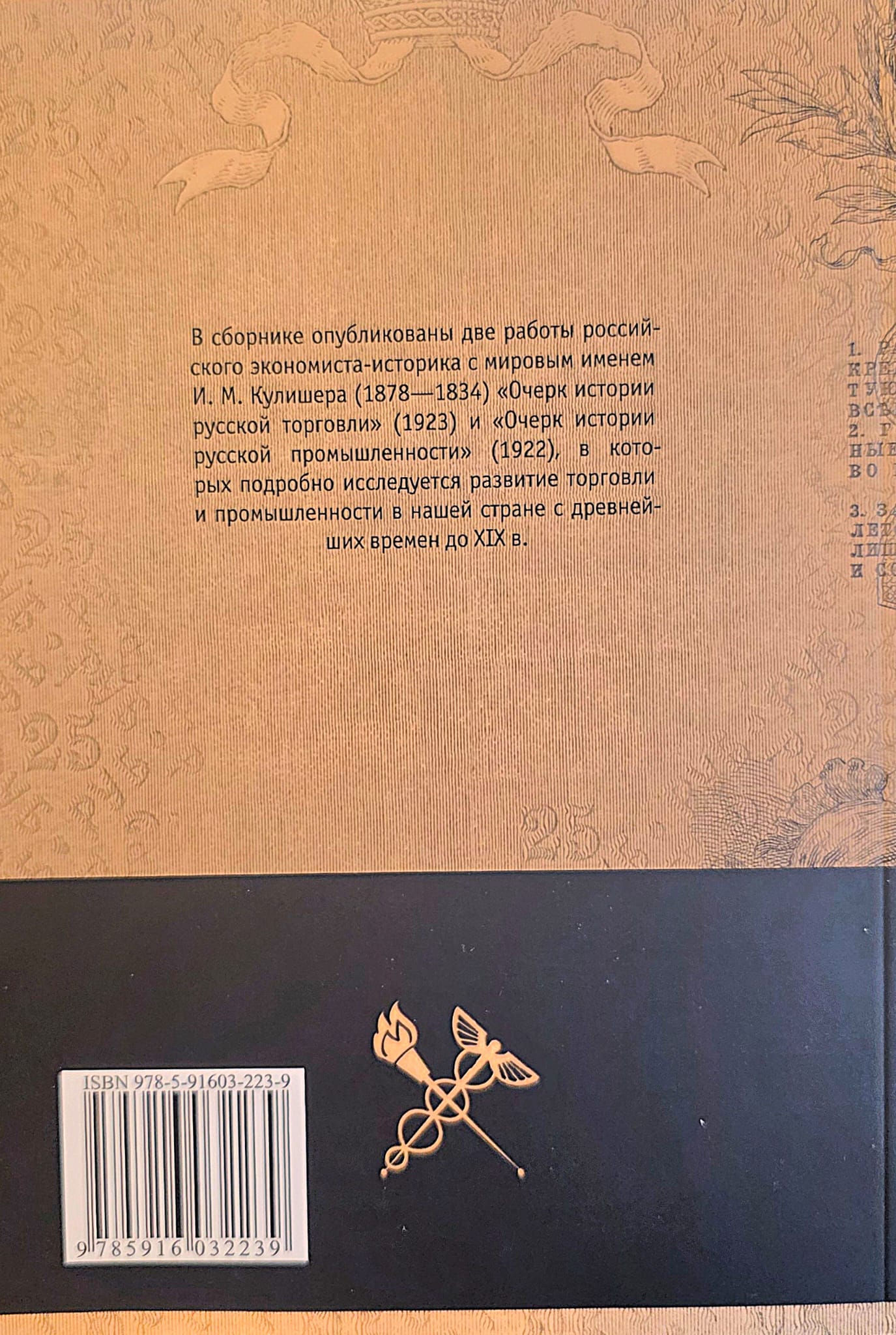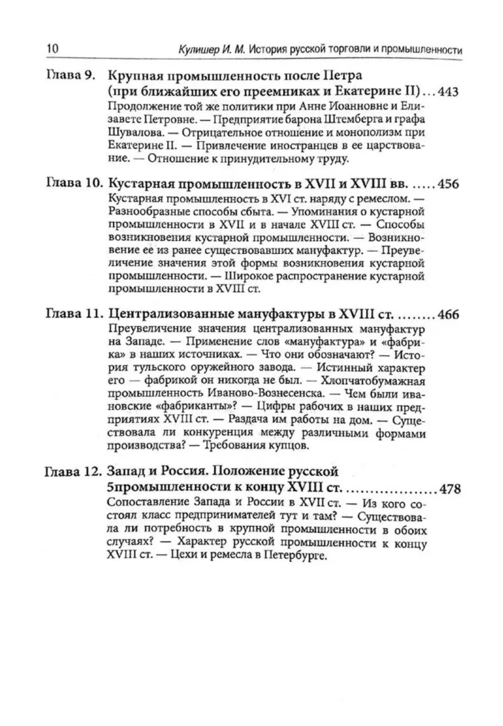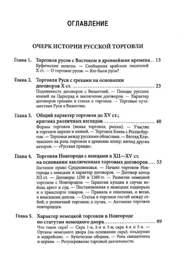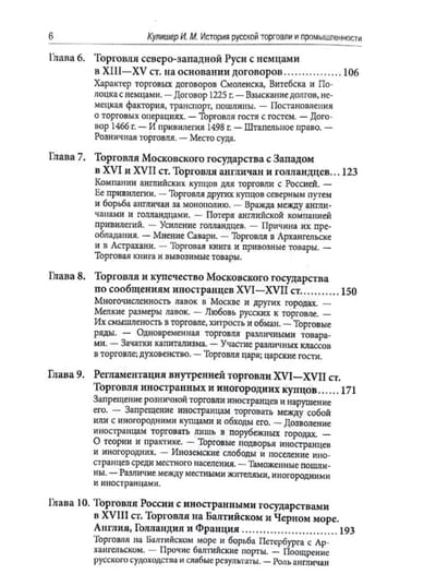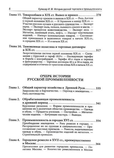 В сборнике опубликованы две работы российского экономиста-историка с мировым именем И. М. Кулишера (1878—1833): «Очерк истории русской торговли» (1923) и «Очерк истории русской промышленности» (1922), в которых подробно исследуется развитие торговли и промышленности в России с древнейших времен до XIX в.