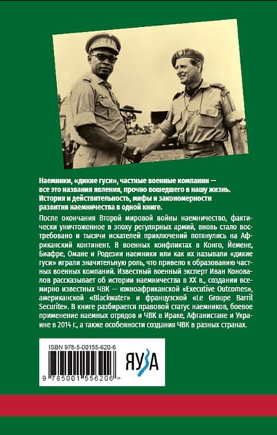 Наемники, «дикие гуси», частные военные компании — все это названия явления, прочно вошедшего в нашу жизнь. История и действительность, мифы и закономерности развития наемничества в одной книге. После окончания Второй мировой войны наемничество, фактически уничтоженное в эпоху регулярных армий, вновь стало востребовано и тысячи искателей приключений потянулись на Африканский континент. В военных конфликтах в Конго, Йемене, Биафре, Омане и Родезии наемники или как их называли «дикие гуси» играли значительную роль, что привело к образованию частных военных компаний. Известный военный эксперт Иван Коновалов рассказывает об истории наемничества в ХХ в., создании всемирно известных ЧВК — южноафриканской «Executive Outcomes», американской «Blackwater» и французской «Le Groupe Barril Sécurité». В книге разбирается правовой статус наемников, боевое применение наемных отрядов и ЧВК в Ираке, Афганистане и Украине в 2014 г., а также особенности создания ЧВК в разных странах.