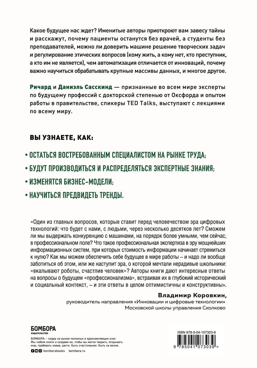 Ричард и Даниэль Сасскинд — признанные во всем мире эксперты с докторской степенью от Оксфорда и опытом работы в Правительстве, спикеры TED Talks, выступают с лекциями по всему миру.