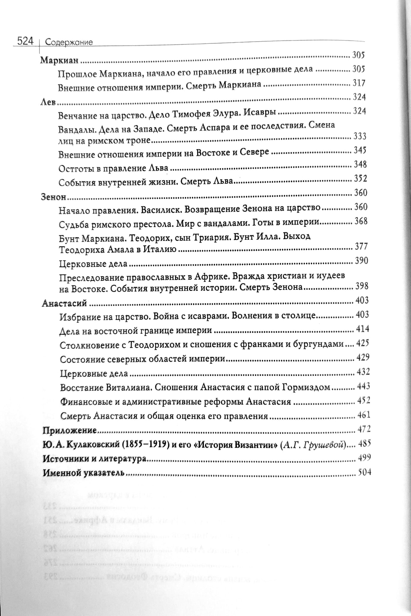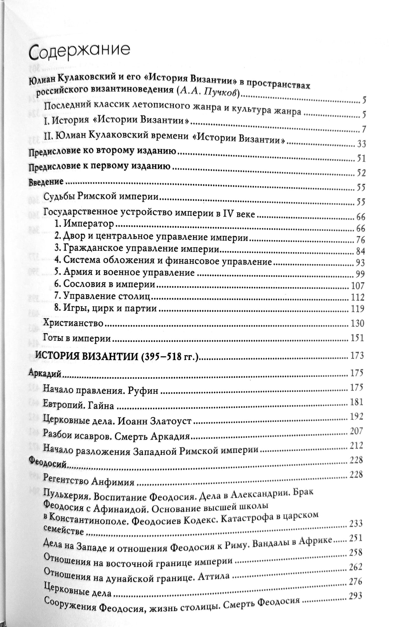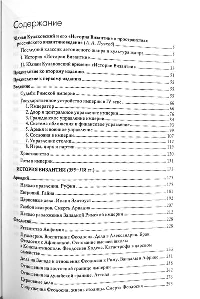 В первом томе после обширного введения изложения истории начинается с момента разделения Римской империи в 395 году до конца правления Анастасия. В сочинении Ю.А. Кулаковского прекрасно изложена внешнеполитическая история и духовная эволюция Византии, описана жизнь столицы, императорского двора, достаточно много говорится о церковных делах и государственных учреждениях. По словам автора, он «ведет читателя своим изложением в самый templum historiae byzantinae (храм истории Византии)».
