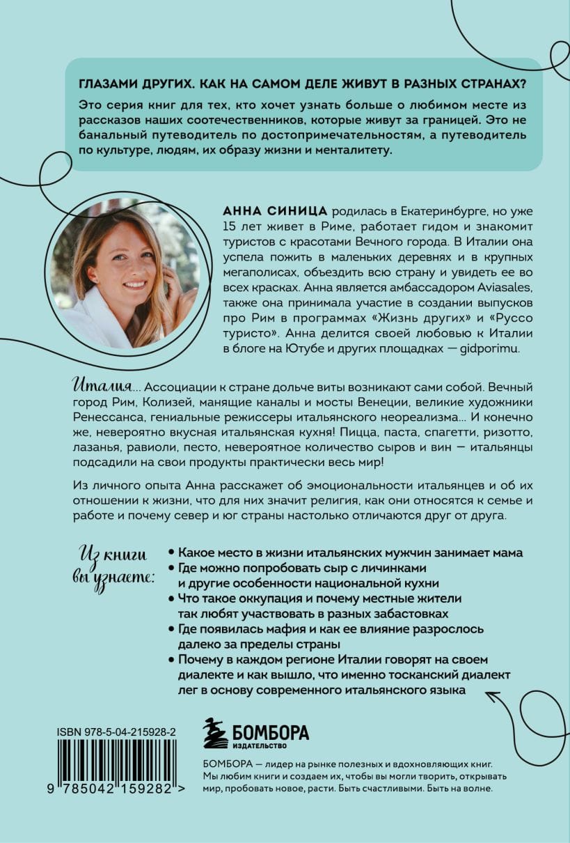 Книга «Италия изнутри» посвящена всем, кто влюблен в страну дольче виты, кому хочется больше узнать о быте и нравах итальянцев, а также проникнуться неповторимой атмосферой колыбели цивилизации и мировой культуры. Анна Синица, гид из Рима, станет для вас личным проводником и поможет разобраться во всех тонкостях итальянской культуры.