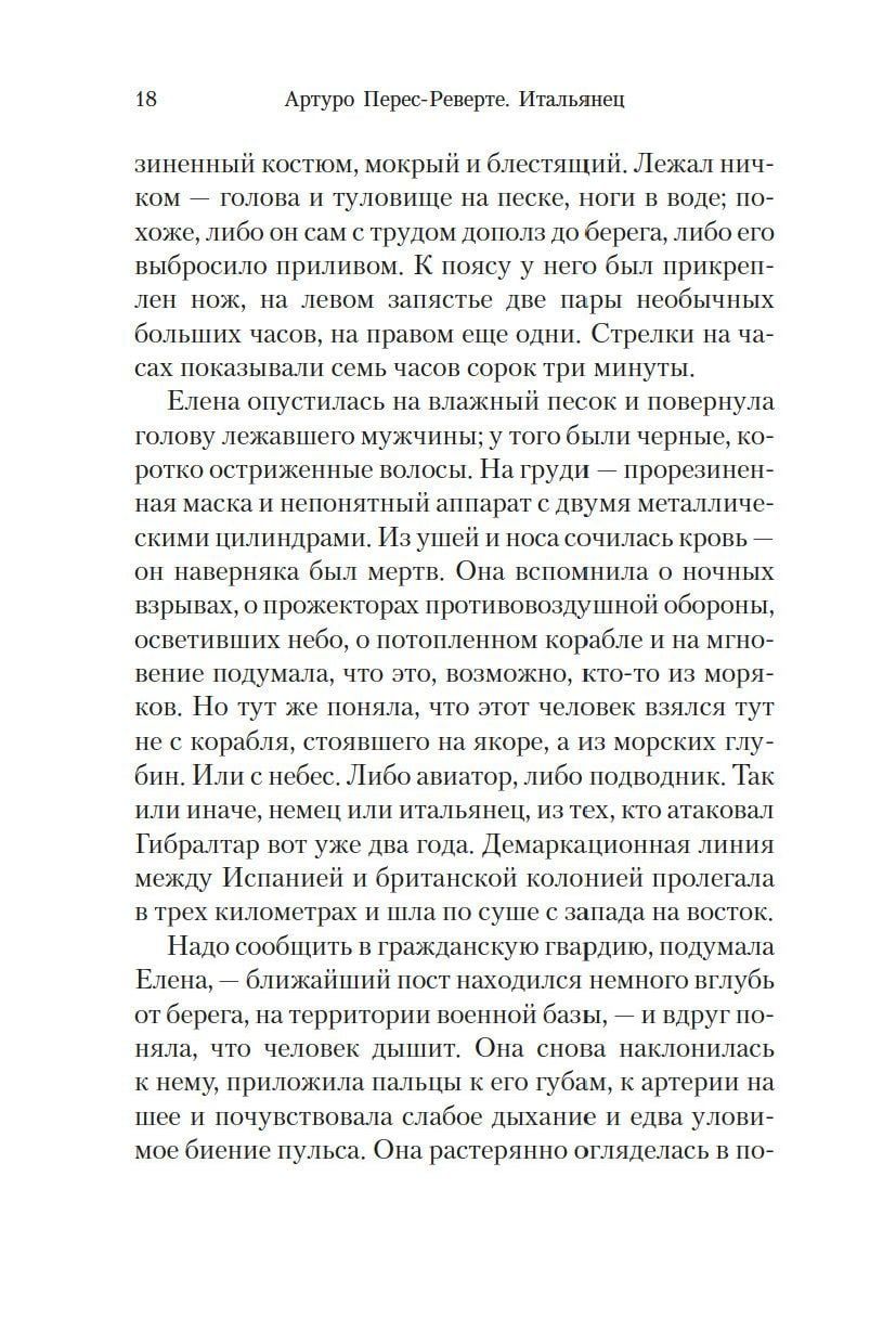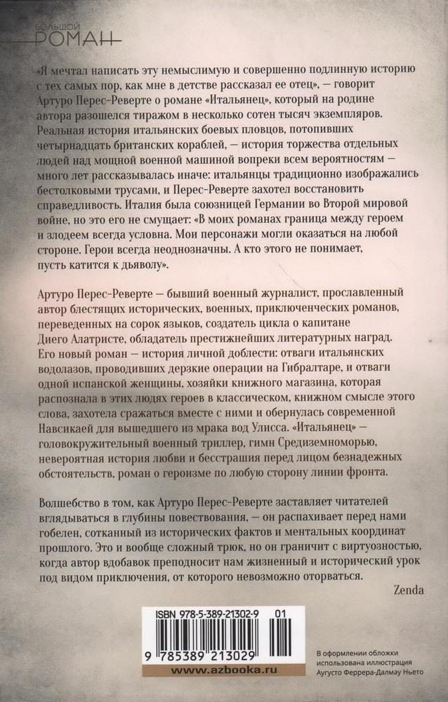 «Я мечтал написать эту немыслимую и совершенно подлинную историю с тех самых пор, как мне в детстве рассказал ее отец», — говорит Артуро Перес-Реверте о романе «Итальянец», который на родине автора разошелся тиражом в несколько сотен тысяч экземпляров. Реальная история итальянских боевых пловцов, потопивших четырнадцать британских кораблей, — история торжества отдельных людей над мощной военной машиной вопреки всем вероятностям — много лет рассказывалась иначе: итальянцы традиционно изображались бестолковыми трусами, и Перес-Реверте захотел восстановить справедливость. Италия была союзницей Германии во Второй мировой войне, но это его не смущает: «В моих романах граница между героем и злодеем всегда условна. Мои персонажи могли оказаться на любой стороне. Герои всегда неоднозначны. А кто этого не понимает, пусть катится к дьяволу». Артуро Перес-Реверте — бывший военный журналист, прославленный автор блестящих исторических, военных, приключенческих романов, переведенных на сорок языков, создатель цикла о капитане Диего Алатристе, обладатель престижнейших литературных наград. Его новый роман — история личной доблести: отваги итальянских водолазов, проводивших дерзкие операции на Гибралтаре, и отваги одной испанской женщины, хозяйки книжного магазина, которая распознала в этих людях героев в классическом, книжном смысле этого слова, захотела сражаться вместе с ними и обернулась современной Навсикаей для вышедшего из мрака вод Улисса. «Итальянец» — головокружительный военный триллер, гимн Средиземноморью, невероятная история любви и бесстрашия перед лицом безнадежных обстоятельств, роман о героизме по любую сторону линии фронта.