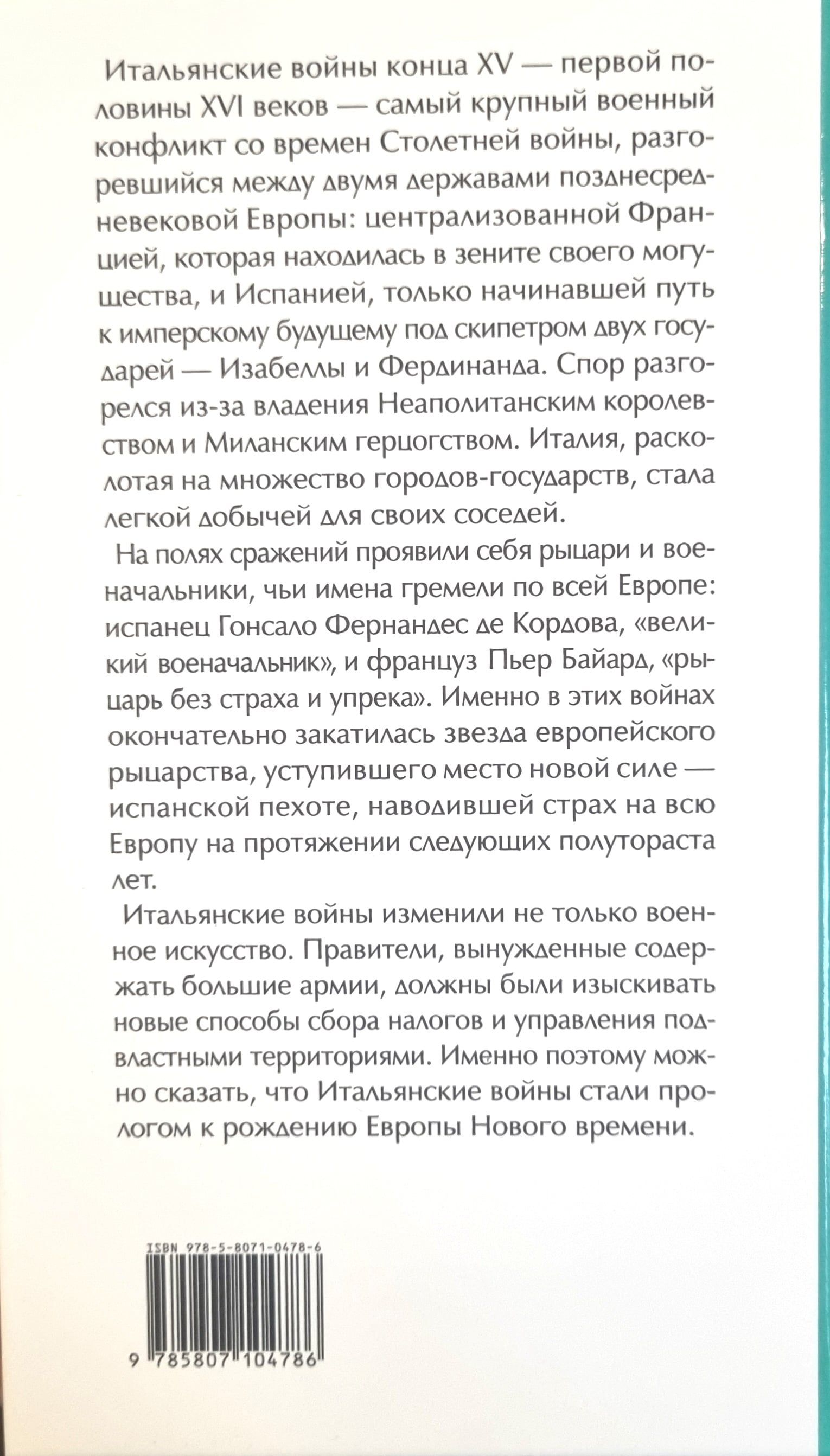 На полях сражений проявили себя рыцари и военачальники, чьи имена гремели по всей Европе: испанец Гонсало Фернандес де Кордова, «великий военачальник», и француз Пьер Баярд, «рыцарь без страха и упрека». Именно в этих войнах окончательно закатилась звезда европейского рыцарства, уступившего место новой силе — испанской пехоте, наводившей страх на всю Европу на протяжении следующих полутораста лет. Итальянские войны изменили не только военное искусство. Правители, вынужденные содержать большие армии, должны были изыскивать новые способы сбора налогов и управления подвластными территориями. Именно поэтому можно сказать, что Итальянские войны стали прологом к рождению Европы Нового времени.