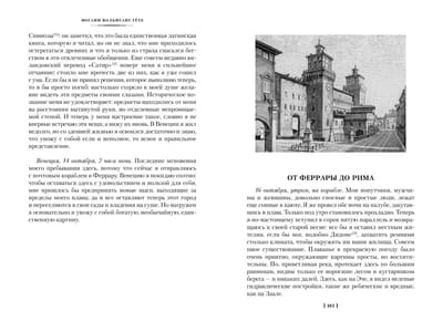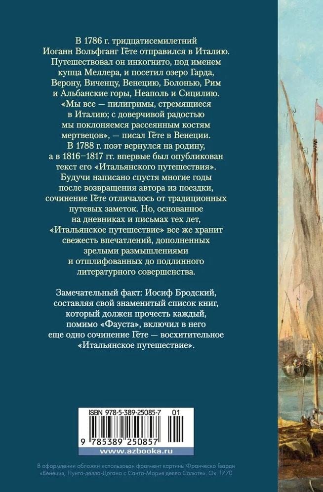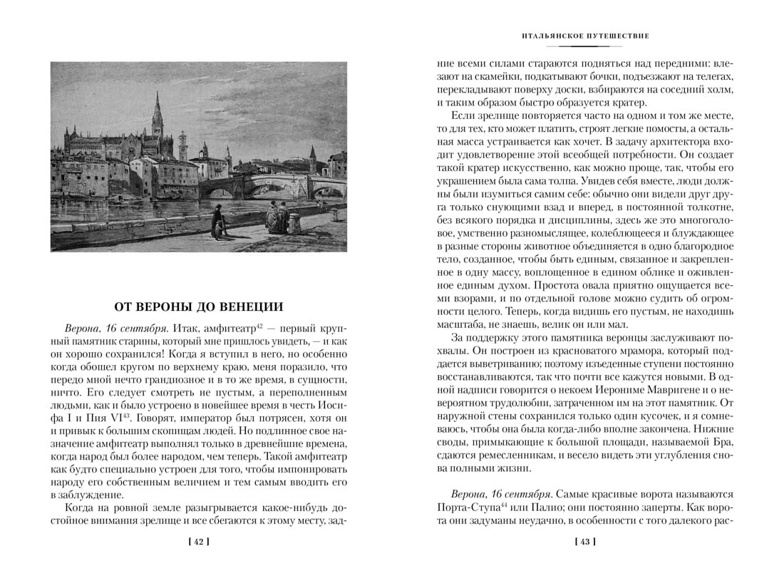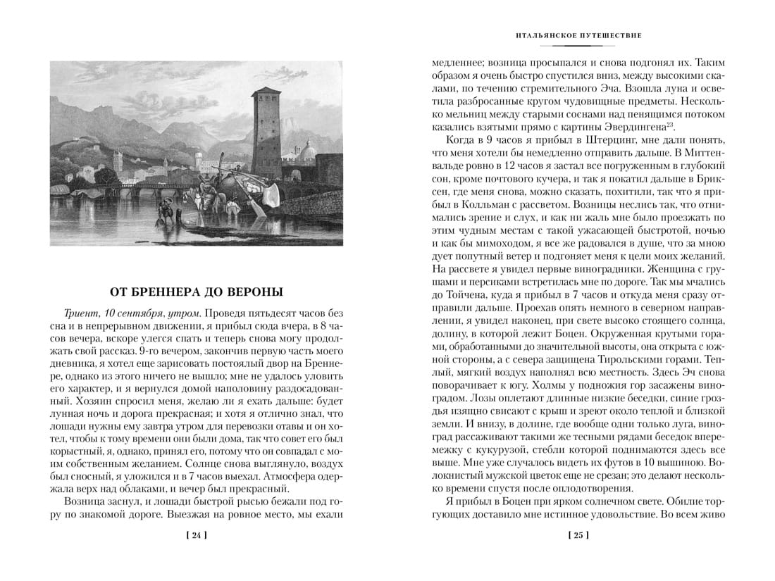 В 1786 г. тридцатисемилетний Иоганн Вольфганг Гёте отправился в Италию. Путешествовал он инкогнито, под именем купца Меллера, и посетил озеро Гарда, Верону, Виченцу, Венецию, Болонью, Рим и Альбанские горы, Неаполь и Сицилию. «Мы все — пилигримы, стремящиеся в Италию; с доверчивой радостью мы поклоняемся рассеянным костям мертвецов», — писал Гёте в Венеции. В 1788 г. поэт вернулся на родину, а в 1816–1817 гг. впервые был опубликован текст его «Итальянского путешествия». Будучи написано спустя многие годы после возвращения автора из поездки, сочинение Гёте отличалось от традиционных путевых заметок. Но, основанное на дневниках и письмах тех лет, «Итальянское путешествие» все же хранит свежесть впечатлений, дополненных зрелыми размышлениями и отшлифованных до подлинного литературного совершенства. Замечательный факт: Иосиф Бродский, составляя свой знаменитый список книг, который должен прочесть каждый, помимо «Фауста», включил в него еще одно сочинение Гёте — восхитительное «Итальянское путешествие».